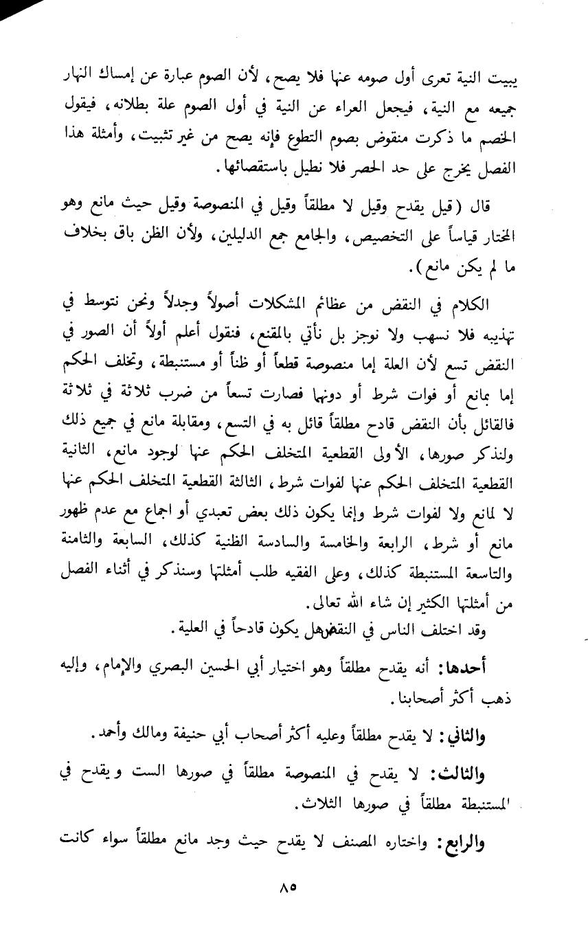 الكلام في النقض من عظائم المشكلات أصولا وجدلا ونحن نتوسط في تهذيبه فلا نسهب ولا نوجز بل نأتي بالمقنع فنقول أعلم أولا أن الصور في النقض تسع لأن العلة إما منصوصة قطعا أو ظنا أو مستنبطة وتخلف الحكم إما بمانع أو فوات شرط أو دونهما فصارت تسعا من ضرب ثلاثة في ثلاثة فالقائل بأن النقض قادح مطلقا قائل به في التسع ومقابلة مانع في جميع ذلك ولنذكر صورها الأولى القطعية المتخلف الحكم عنها لوجود مانع الثانية القطعية المتخلف الحكم عنها لفوات الشرط الثالثة القطعية المتخلف الحكم عنها لا لمانع ولا لفوات شرط وإنما يكون ذلك بعض تعبدي أو إجماع مع عدم ظهور مانع أو شرط الرابعة والخامسة والسادسة الظنية كذلك السابعة والثامنة والتاسعة المستنبطة كذلك وعلى الفقيه طلب أمثلتها وسنذكر في أثناء الفصل من أمثلتها الكثير إن شاء الله تعالى