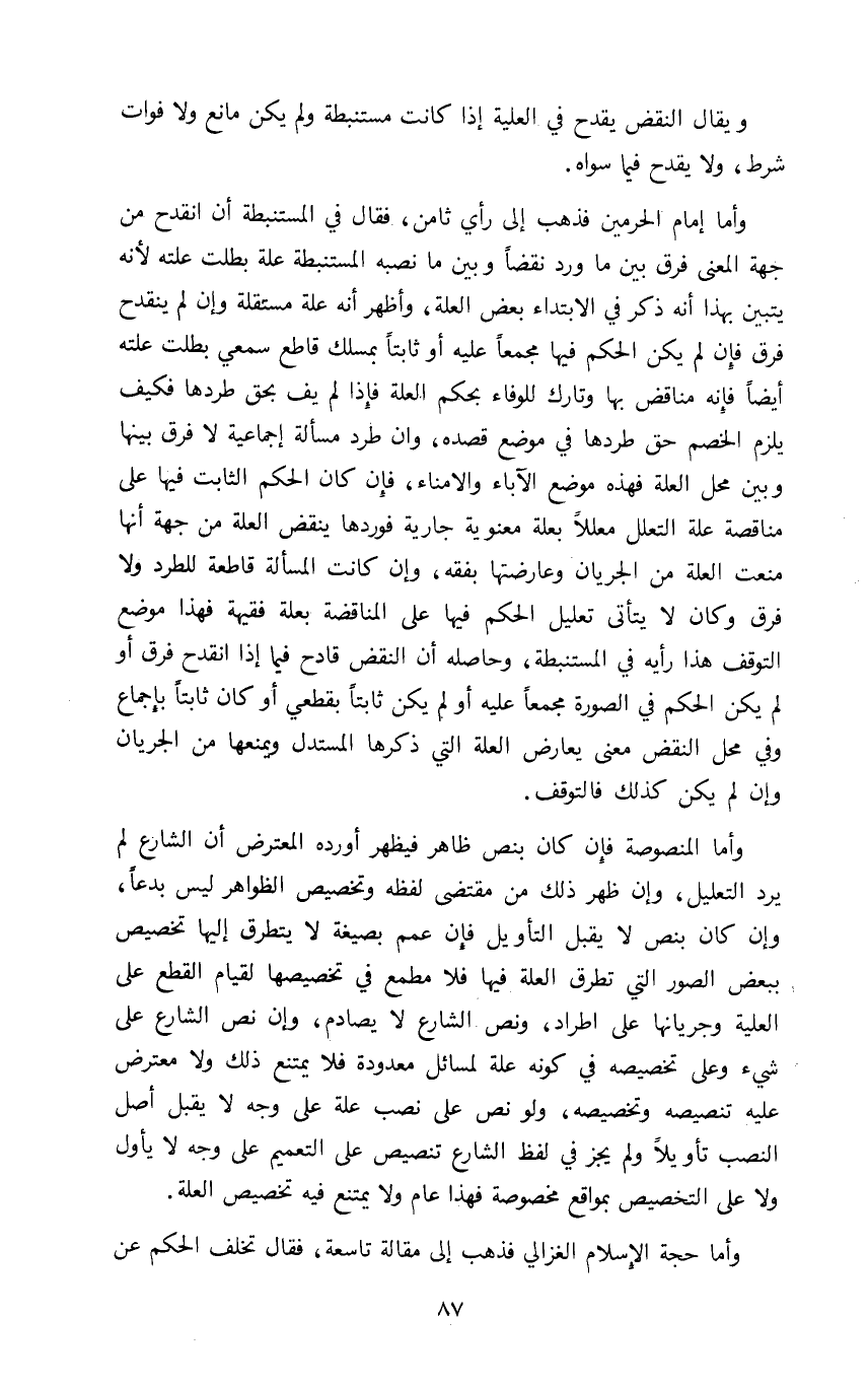 وإما إمام الحرمين فذهب إلى رأي ثامن فقال في المستنبطة أن انقدح من جهة المعنى فرق بين ما ورد نقضا وبين ما نصبه المستنبطة علة بطلت علته لأنه يتبين بهذا أنه ذكر في الابتداء بعض العلة وأظهر أنه علة مستقلة وإن لم ينقدح فرق فإن لم يكن الحكم فيها مجمعا عليه أو ثابتا بمسلك قاطع سمعي بطلت علته أيضا فإنه مناقض بها وتارك للوفاء بحكم العلة فإذا لم يف بحق طردها فكيف يلزم الخصم حق طردها في موضع قصده وإن طرد مسألة اجماعية لا فرق بينها وبين محل العلة فهذه موضع الآباء والامناء فإن كان الحكم الثابت فيها على مناقصة علة التعلل معللا بعلة معنوية جارية فوردها ينقض العلة من جهة أنها منعت العلة من الجريان وعارضتها بفقه وإن كانت المسألة قاطعة للطرد ولا فرق وكان لا يتأتى تعليل الحكم فيها على المناقضة بعلة فقيهة فهذا موضع التوقف هذا رأيه في المستنبطة وحاصله أن النقض قادح فيما إذا انقدح فرق أو لم يكن الحكم في الصورة مجمعا عليه أو لم يكن ثابتا بقطعي أو كان ثابتا بإجماع وفي محل النقض معنى يعارض العلة التي ذكرها المستدل ويمنعها من الجريان وإن لم يكن كذلك فالتوقف