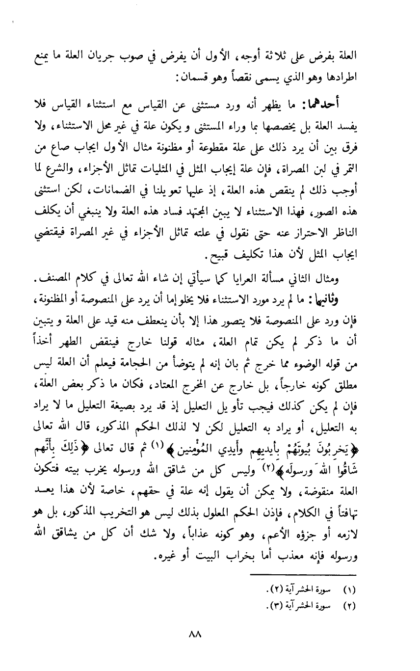 وثانيهما ما لم يرد مورد الاستثناء فلا يخلو إما أن يرد على المنصوصة أو المظنونة فإن ورد على المنصوصة فلا يتصور هذا إلا بأن ينعطف منه قيد على العلة ويتبين أن ما ذكر لم يكن تمام العلة مثاله قولنا خارج فينقض الطهر أخذا من قوله الوضوء مما خرج ثم بان إنه لم يتوضأ من الحجامة فيعلم أن العلة ليس مطلق كونه خارجا بل خارج عن المخرج المعتاد فكان ما ذكر بعض العلة فإن لم يكن كذلك فيجب تأويل التعليل إذ قد يرد بصيغة التعليل ما لا يراد به التعليل أو يراد به التعليل لكن لا لذلك الحكم المذكور قال الله تعالى: {يُخْرِبُونَ بُيُوتَهُمْ بِأَيْدِيهِمْ وَأَيْدِي الْمُؤْمِنِينَ١} ثم قال تعالى: {ذَلِكَ بِأَنَّهُمْ شَاقُّوا اللَّهَ وَرَسُولَهُ٢} وليس كل من شاقق الله ورسوله يخرب بيته فتكون العلة منقوضة ولا يمكن أن يقول إنه علة في حقهم خاصة لأن هذا يعد تهافتا في الكلام فإذن الحكم المعلول بذلك ليس هو التخريب المذكور بل هو لازمه أو جزؤه الأعم وهو كونه عذابا ولا شك أن كل من يشاقق الله ورسوله فإنه معذب أما بخراب البيت أو غيره