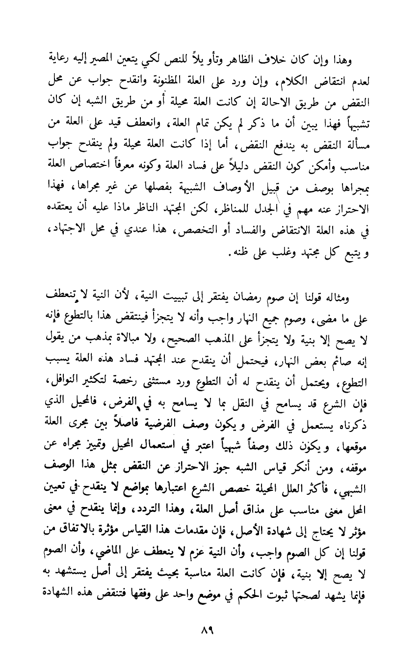 وهذا وإن كان خلاف الظاهر وتأويلا للنص لكي يتعين المصير إليه رعاية لعدم انتقاض الكلام وإن ورد على العلة المظنونة وانقدح جواب عن محل النقض من طريق الإحالة إن كانت العلة محيلة أو من طريق الشبه إن كان تشبيها فهذا يبين أن ما ذكر لم يكن تمام العلة وانعطف قيد على العلة من مسألة النقض به يندفع النقض أما إذا كانت العلة محيلة ولم ينقدح جواب مناسب وأمكن كون النقض دليلا على فساد العلة وكونه معرفا اختصاص العلة بمجراها بوصف من قبيل الأوصاف الشبيهة بفصلها عن غير مجراها فهذا الاحتراز عنه مهم في الجدل للمناظر لكن المجتهد الناظر ماذا عليه أن يعتقده في هذه العلة الانتقاض والفساد أو التخصص هذا عندي في محل الاجتهاد ويتبع كل مجتهد وغلب على ظنه