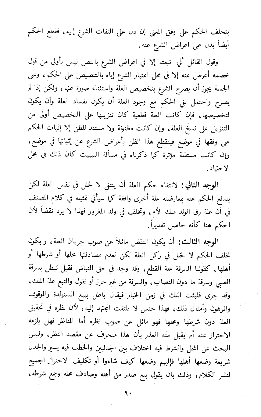 الوجه الثالث أن يكون النقض مائلا عن صوب جريان العلة ويكون تخلف الحكم لا لخلل في ركن العلة لكن لعدم مصادفتها محلها أو شرطها أو أهلها كقولنا السرقة علة القطع وقد وجد في حق النباش فقيل تبطل بسرقة الصبي وسرقة ما دون النصاب والسرقة من غير حرز أو نقول والتبع علة الملك وقد جرى فلبثت الملك في زمن الخيار فيقال باطل ببيع المستولدة والموقوف والمرهون وأمثال ذلك فهذا جنس لا يلتفت المجتهد إليه لأن نظره في تحقيق العلة دون شرطها ومحلها فهو مائل عن صوب نظره أما المناظر فهل يلزمه الاحتراز عنه أم يقبل منه العذر بأن هذا منحرف عن مقصد النظر وليس البحث عن المحل والشرط فيه اختلاف بين الجدليين والخطب فيه يسير والجدل شريعة وضعها أهلها فإليهم وضعها كيف شاءوا أو تكليف الاحتراز الجميع لنشر الكلام وذلك بأن يقول بيع صدر من أهله وصادف محله وجمع شرطه