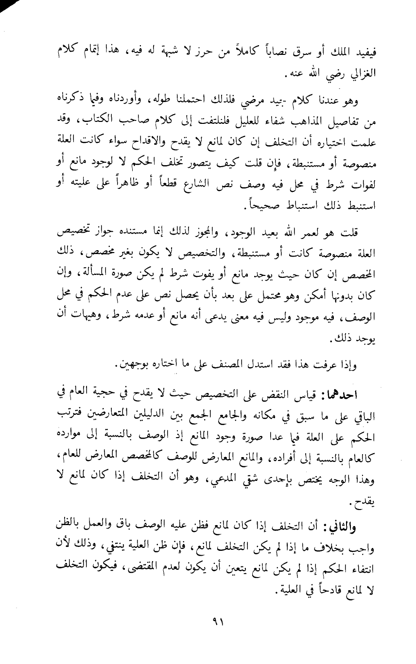 والثاني أن التخلف إذا كان لمانع فظن عليه الوصف باق والعمل بالظن واجب بخلاف ما إذا لم يكن التخلف لمانع فإن ظن العلية ينتفي وذلك لأن انتفاء الحكم إذا لم يكن لمانع يتعين أن يكون لعدم المقتضى فيكون التخلف لا لمانع قادحا في العلية