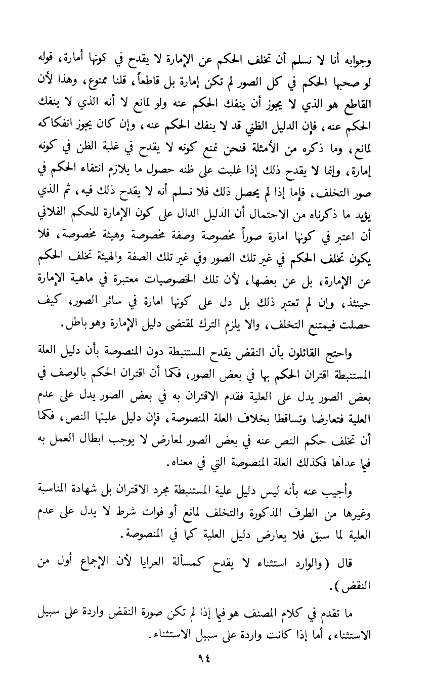 واحتج القائلون بأن النقض يقدح المستنبطة دون المنصوصة بأن دليل العلة المستنبطة اقتران الحكم بها في بعض الصور فكما أن اقتران الحكم بالوصف في بعض الصور يدل على العلية فقدم الاقتران به في بعض الصور يدل على عدم العلية فتعارضا وتساقطا بخلاف العلة المنصوصة فإن دليل عليتها النص فكما أن تخلف حكم النص عنه في بعض الصور لمعارض لا يوجب إبطال العمل به فيما عداها فكذلك العلة المنصوصة التي في معناها