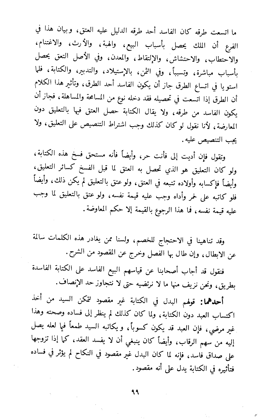 أحدهما قولهم البدل في الكتابة غير مقصود لتمكن السيد من أخذ اكتساب العبد دون الكتابة ولما كان كذلك لم ينظر إلى فساده وصحته وهذا غير مرضي فإن العبد قد يكون كسوبا ويكاتبه السيد طمعا فيما لعله يصل إليه من سهم الرقاب وأيضا كان ينبغي أن لا يفسد العقد كما إذا تزوجها على صداق فاسد فإنه لما كان البدل غير مقصود في النكاح لم يؤثر في فساده فتأثيره في الكتابة يدل على أنه مقصود