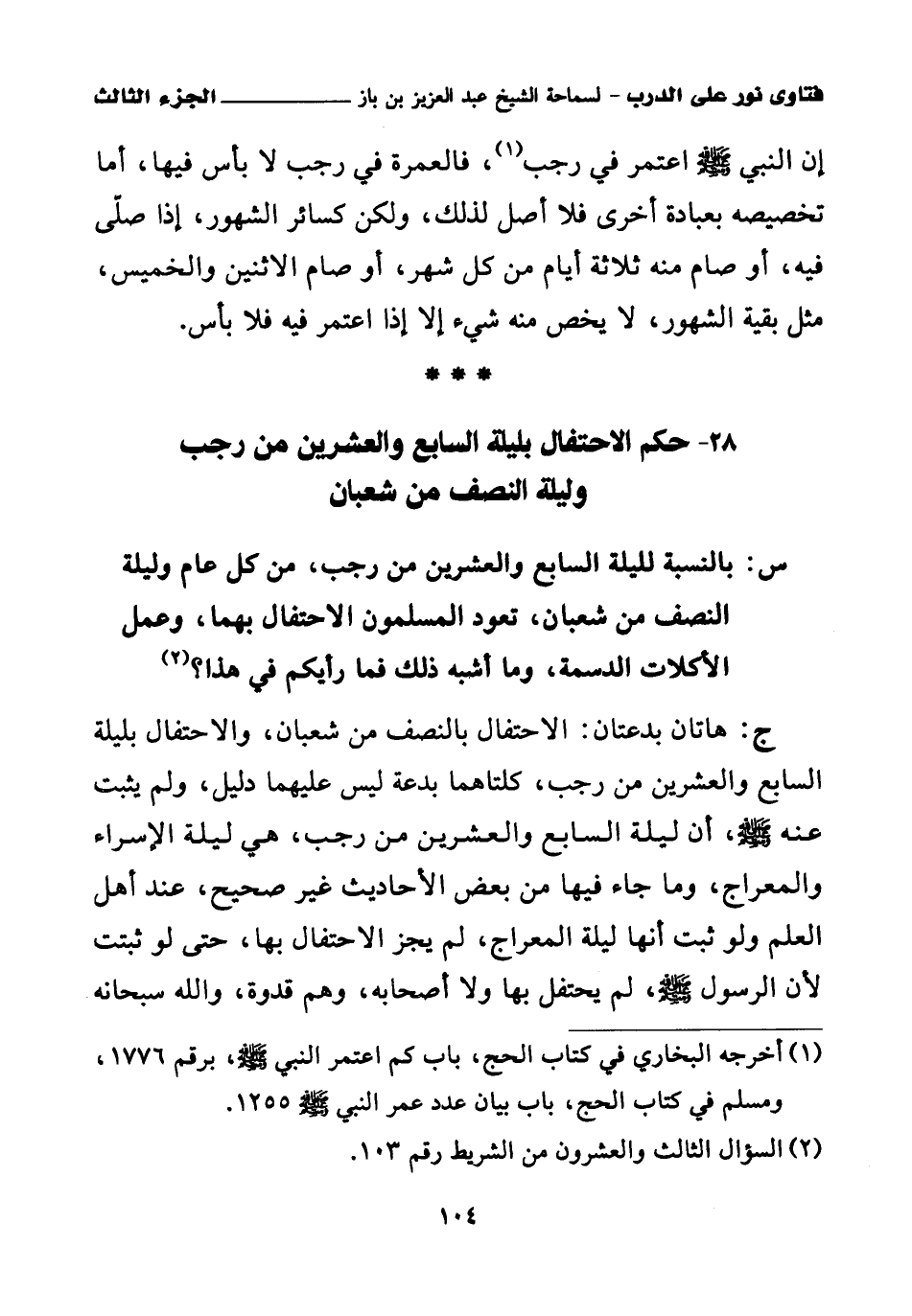 ج: هاتان بدعتان: الاحتفال بالنصف من شعبان، والاحتفال بليلة السابع والعشرين من رجب، كلتاهما بدعة ليس عليهما دليل، ولم يثبت عنه صلى الله عليه وسلم، أن ليلة السابع والعشرين من رجب، هي ليلة الإسراء والمعراج، وما جاء فيها من بعض الأحاديث غير صحيح، عند أهل العلم ولو ثبت أنها ليلة المعراج، لم يجز الاحتفال بها، حتى لو ثبتت لأن الرسول صلى الله عليه وسلم، لم يحتفل بها ولا أصحابه، وهم قدوة، والله سبحانه