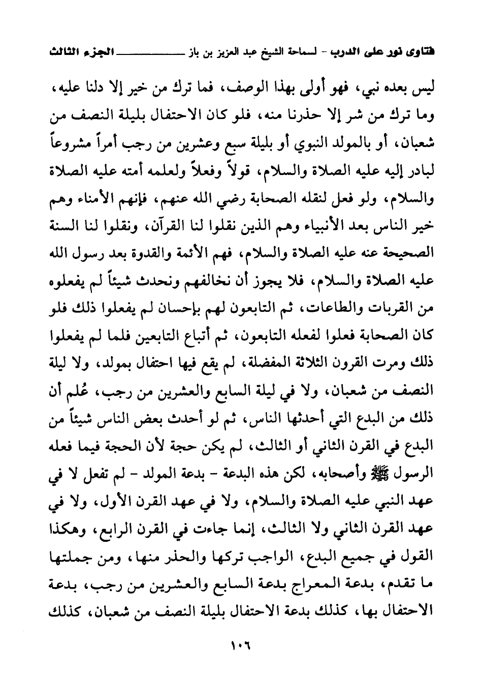 ليس بعده نبي، فهو أولى بهذا الوصف، فما ترك من خير إلا دلنا عليه، وما ترك من شر إلا حذرنا منه، فلو كان الاحتفال بليلة النصف من شعبان أو بالمولد النبوي أو بليلة سبع وعشرين من رجب أمرا مشروعا لبادر إليه عليه الصلاة والسلام، قولا وفعلا ولعلمه أمته عليه الصلاة والسلام، ولو فعل لنقله الصحابة رضي الله عنهم، فإنهم الأمناء وهم خير الناس بعد الأنبياء وهم الذين نقلوا لنا القرآن، ونقلوا لنا السنة الصحيحة عنه عليه الصلاة والسلام، فهم الأئمة والقدوة بعد رسول الله عليه الصلاة والسلام، فلا يجوز أن نخالفهم ونحدث شيئا لم يفعلوه من القربات والطاعات، ثم التابعون لهم بإحسان لم يفعلوا ذلك فلو كان الصحابة فعلوا لفعله التابعون، ثم أتباع التابعين فلما لم يفعلوا ذلك ومرت القرون الثلاثة المفضلة، لم يقع فيها احتفال بمولد، ولا ليلة النصف من شعبان، ولا في ليلة السابع والعشرين من رجب، علم أن ذلك من البدع التي أحدثها الناس، ثم لو أحدث بعض الناس شيئا من البدع في القرن الثاني أو الثالث، لم يكن حجة لأن الحجة فيما فعله الرسول صلى الله عليه وسلم وأصحابه، لكن هذه البدعة - بدعة المولد - لم تفعل لا في عهد النبي عليه الصلاة والسلام، ولا في عهد القرن الأول، ولا في عهد القرن الثاني ولا الثالث، إنما جاءت في القرن الرابع، وهكذا القول في جميع البدع، الواجب تركها والحذر منها، ومن جملتها ما تقدم، بدعة المعراج بدعة السابع والعشرين من رجب، بدعة الاحتفال بها، كذلك بدعة الاحتفال بليلة النصف من شعبان، كذلك