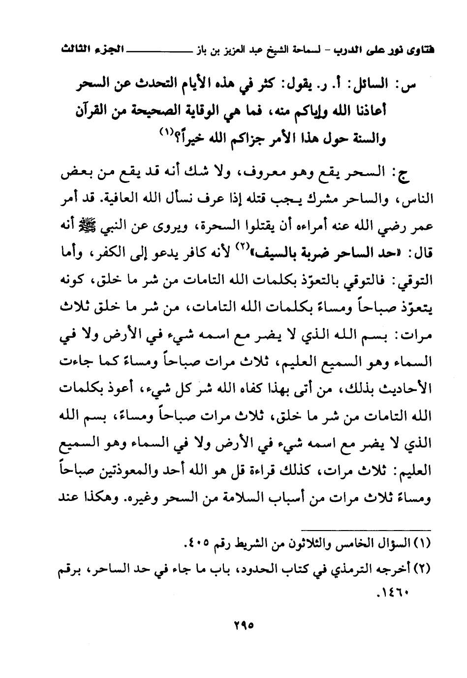 ج: السحر يقع وهو معروف، ولا شك أنه قد يقع من بعض الناس، والساحر مشرك يجب قتله إذا عرف نسأل الله العافية، قد أمر عمر رضي الله عنه أمراءه أن يقتلوا السحرة، ويروى عن النبي صلى الله عليه وسلم أنه قال: «حد الساحر ضربة بالسيف (¬2)»؛ لأنه كافر يدعو إلى الكفر، وأما التوقي: فالتوقي بالتعوذ بكلمات الله التامات من شر ما خلق، كونه يتعوذ صباحا ومساء بكلمات الله التامات من شر ما خلق ثلاث مرات: بسم الله الذي لا يضر مع اسمه شيء في الأرض ولا في السماء وهو السميع العليم، ثلاث مرات صباحا ومساء كما جاءت الأحاديث بذلك، من أتى بهذا كفاه الله شر كل شيء، أعوذ بكلمات الله التامات من شر ما خلق، ثلاث مرات صباحا ومساء، بسم الله الذي لا يضر مع اسمه شيء في الأرض ولا في السماء وهو السميع العليم: ثلاث مرات، كذلك قراءة قل هو الله أحد، والمعوذتين صباحا ومساء ثلاث مرات من أسباب السلامة من السحر وغيره. وهكذا عند