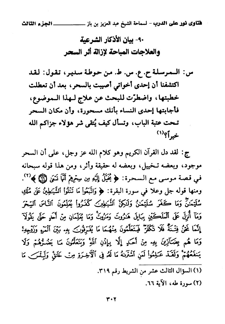 س: المرسلة ح. ع. س. ط. من حوطة سدير، تقول: لقد اكتشفنا أن إحدى أخواتي أصيبت بالسحر، بعد أن تعطلت خطبتها، واضطرت للبحث عن علاج لهذا الموضوع، فأجابتها إحدى النساء بأنك مسحورة، وأن مكان السحر تحت عتبة الباب، وتسأل كيف يتقى شر هؤلاء جزاكم الله خيرا؟ (¬1)