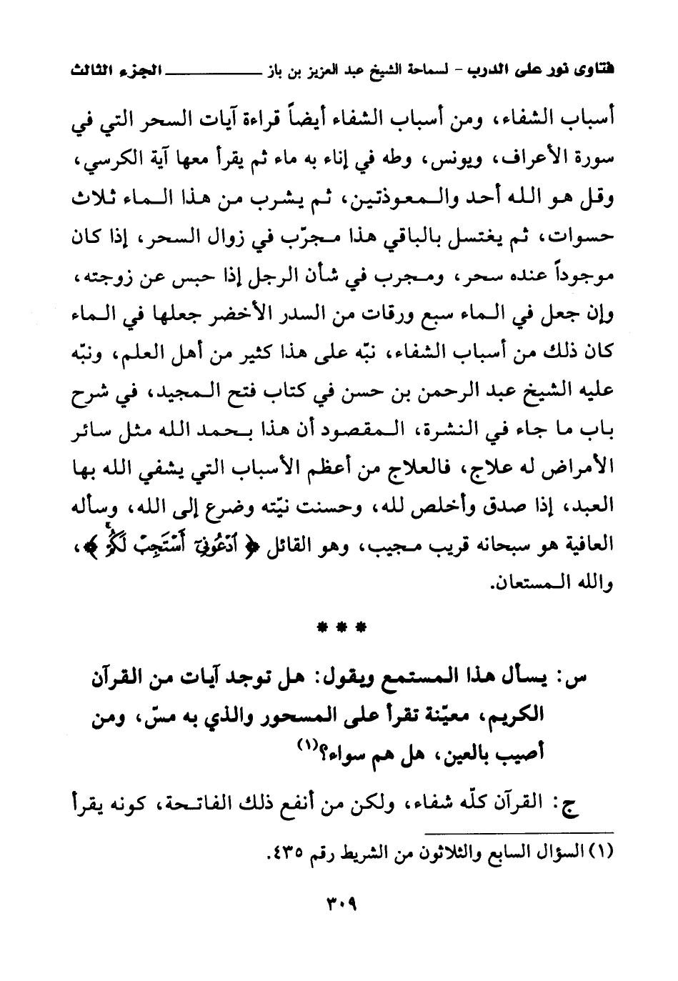 أسباب الشفاء، ومن أسباب الشفاء أيضا قراءة آيات السحر التي في سورة الأعراف، ويونس، وطه في إناء به ماء ثم يقرأ معها آية الكرسي، وقل هو الله أحد والمعوذتين، ثم يشرب من هذا الماء ثلاث حسوات، ثم يغتسل بالباقي هذا مجرب في زوال السحر، إذا كان موجودا عنده سحر، ومجرب في شأن الرجل إذا حبس عن زوجته، وإن جعل في الماء سبع ورقات من السدر الأخضر جعلها في الماء كان ذلك من أسباب الشفاء، نبه على هذا كثير من أهل العلم، ونبه عليه الشيخ عبد الرحمن بن حسن في كتاب فتح المجيد، في شرح باب ما جاء في النشرة، المقصود أن هذا بحمد الله مثل سائر الأمراض له علاج، فالعلاج من أعظم الأسباب التي يشفي الله بها العبد، إذا صدق وأخلص لله، وحسنت نيته وضرع إلى الله، وسأله العافية هو سبحانه قريب مجيب، وهو القائل {ادْعُونِي أَسْتَجِبْ لَكُمْ} (¬1)، والله المستعان.