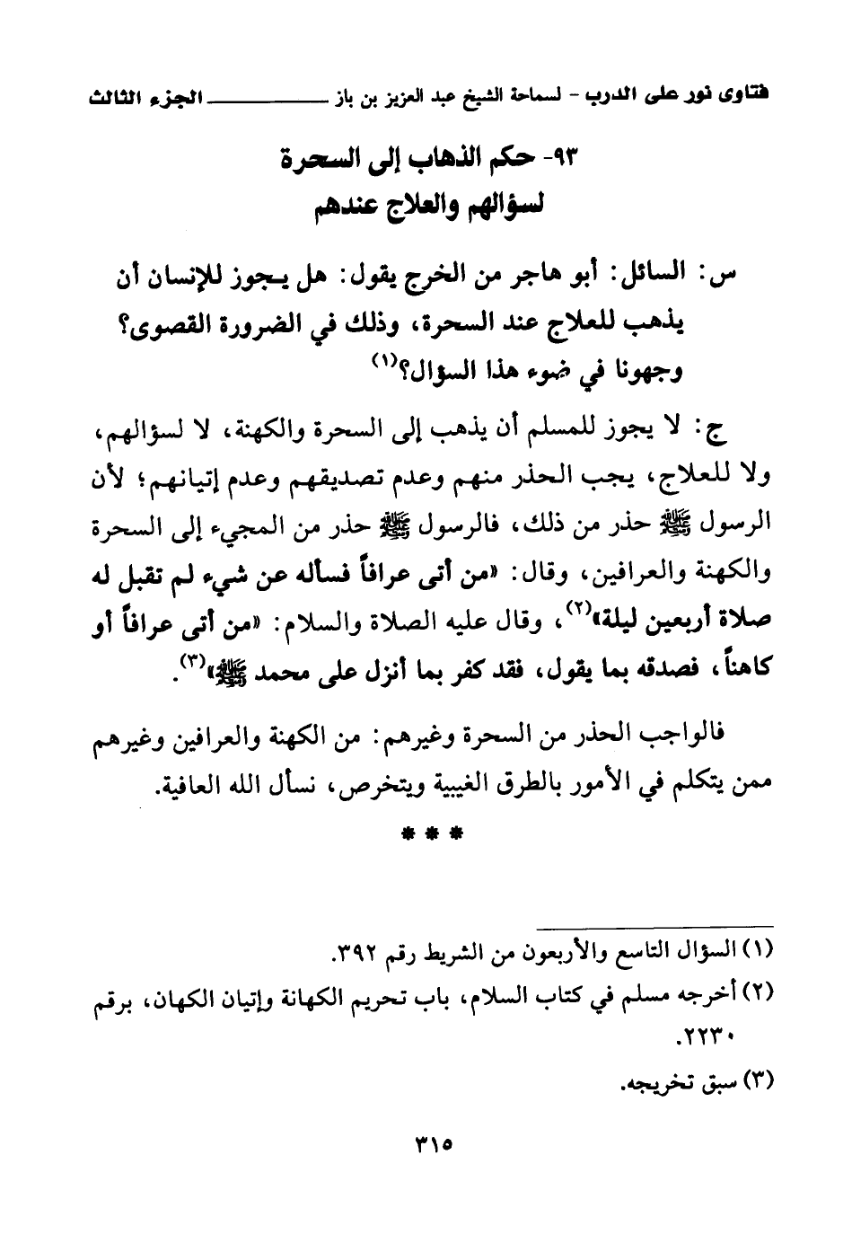 93 - حكم الذهاب إلى السحرة لسؤالهم والعلاج عندهم