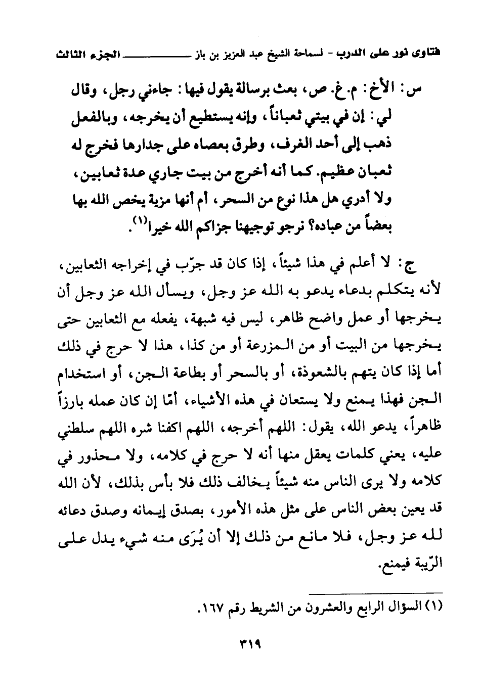 ج: لا أعلم في هذا شيئا، إذا كان قد جرب في إخراجه الثعابين، لأنه يتكلم بدعاء يدعو به الله عز وجل، ويسأل الله عز وجل أن يخرجها أو عمل واضح ظاهر، ليس فيه شبهة، يفعله مع الثعابين حتى يخرجها من البيت أو من المزرعة أو من كذا، هذا لا حرج في ذلك أما إذا كان يتهم بالشعوذة، أو بالسحر أو بطاعة الجن، أو استخدام الجن فهذا يمنع ولا يستعان في هذه الأشياء، أما إن كان عمله بارزا ظاهرا، يدعو الله، يقول: اللهم أخرجه، اللهم اكفنا شره اللهم سلطني عليه، يعني كلمات يعقل منها أنه لا حرج في كلامه، ولا محذور في كلامه ولا يرى الناس منه شيئا يخالف ذلك فلا بأس بذلك، لأن الله قد يعين بعض الناس على مثل هذه الأمور، بصدق إيمانه وصدق دعائه لله عزل وجل، فلا مانع من ذلك إلا أن يرى منه شيء يدل على الريبة فيمنع.