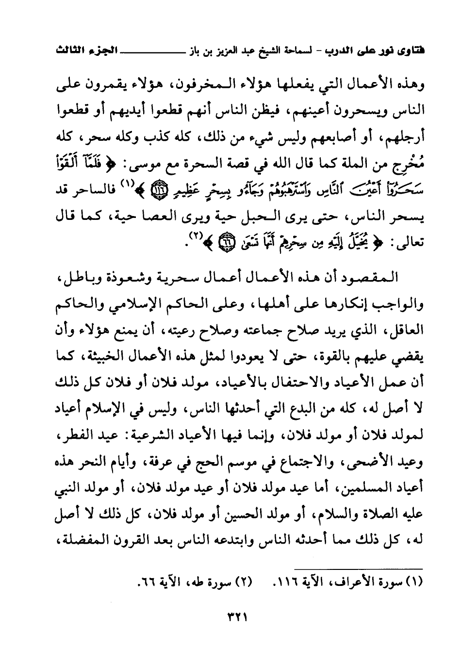 المقصود أن هذه الأعمال أعمال سحرية وشعوذة وباطل، والواجب إنكارها على أهلها، وعلى الحاكم الإسلامي والحاكم العاقل، الذي يريد صلاح جماعته وصلاح رعيته، أن يمنع هؤلاء وأن يقضي عليهم بالقوة، حتى لا يعودوا لمثل هذه الأعمال الخبيثة، كما أن عمل الأعياد والاحتفال بالأعياد، مولد فلان أو فلان كل ذلك لا أصل له، كله من البدع التي أحدثها الناس، وليس في الإسلام أعياد لمولد فلان أو مولد فلان، وإنما فيها الأعياد الشرعية: عيد الفطر، وعيد الأضحى، والاجتماع في موسم الحج في عرفة، وأيام النحر هذه أعياد المسلمين، أما عيد مولد فلان أو عيد مولد فلان أو مولد النبي عليه الصلاة والسلام، أو مولد الحسين أو مولد فلان، كل ذلك لا أصل له، كل ذلك مما أحدثه الناس وابتدعه الناس بعد القرون المفضلة،
