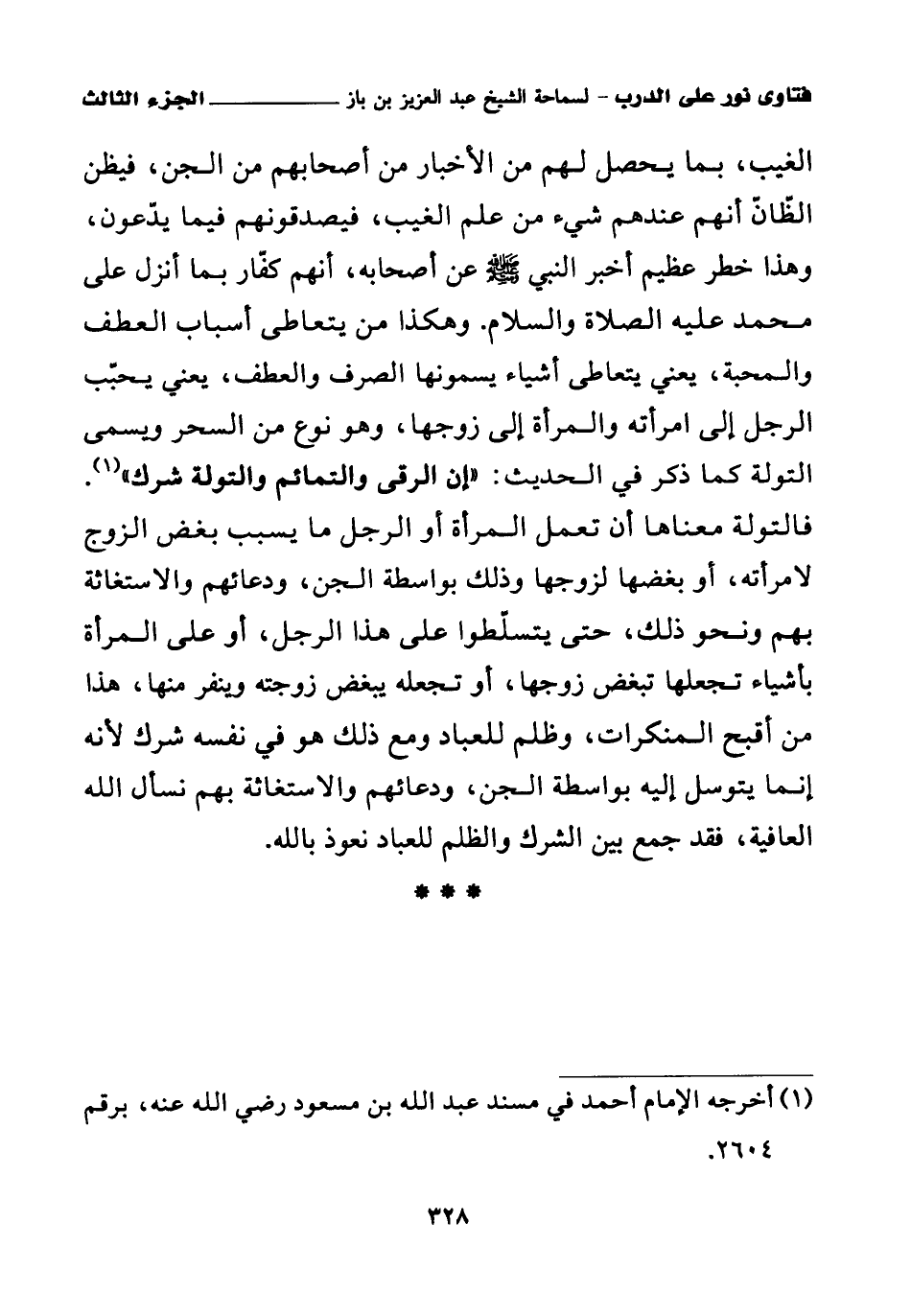الغيب، بما يحصل لهم من الأخبار من أصحابهم من الجن، فيظن الظان أنهم عندهم شيء من علم الغيب، فيصدقونهم فيما يدعون، وهذا خطر عظيم أخبر النبي صلى الله عليه وسلم عن أصحابه، أنهم كفار بما أنزل على محمد عليه الصلاة والسلام، وهكذا من يتعاطى أسباب العطف والمحبة، يعني يتعاطى أشياء يسمونها الصرف والعطف، يعني يحبب الرجل إلى امرأته والمرأة إلى زوجها، وهو نوع من السحر ويسمى التولة كما ذكر في الحديث: «إن الرقى والتمائم والتولة شرك (¬1)». فالتولة معناها أن تعمل المرأة أو الرجل ما يسبب بغض الزوج لامرأته، أو بغضها لزوجها وذلك بواسطة الجن، ودعائهم والاستغاثة بهم ونحو ذلك، حتى يتسلطوا على هذا الرجل، أو على المرأة بأشياء تجعلها تبغض زوجها، أو تجعله يبغض زوجته وينفر منها، هذا من أقبح المنكرات، وظلم للعباد ومع ذلك هو في نفسه شرك لأنه إنما يتوسل إليه بواسطة الجن، ودعائهم والاستغاثة بهم. نسأل الله العافية، فقد جمع بين الشرك والظلم للعباد. نعوذ بالله.
