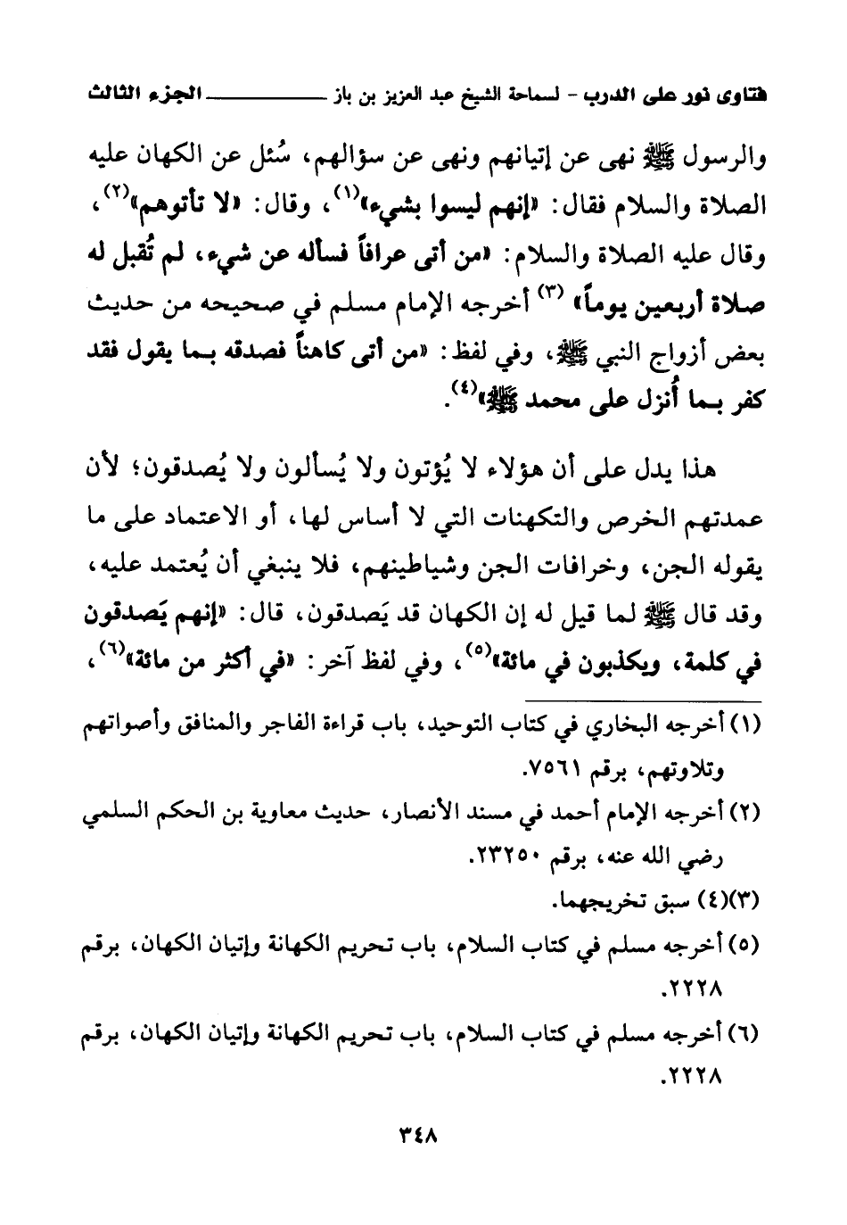 (¬3) أخرجه مسلم في كتاب السلام، باب تحريم الكهانة وإتيان الكهان، برقم 2230