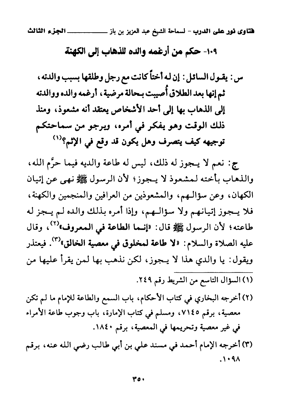 ج: نعم لا يجوز له ذلك، ليس له طاعة والديه فيما حرم الله، والذهاب بأخته لمشعوذ لا يجوز؛ لأن الرسول صلى الله عليه وسلم نهى عن إتيان الكهان، وعن سؤالهم، والمشعوذين من العرافين والمنجمين والكهنة، فلا يجوز إتيانهم ولا سؤالهم، وإذا أمره بذلك والده لم يجز له طاعته؛ لأن الرسول صلى الله عليه وسلم قال: «إنما الطاعة في المعروف (¬2)»، وقال عليه الصلاة والسلام: «لا طاعة لمخلوق في معصية الخالق (¬3)». فيعتذر ويقول: يا والدي هذا لا يجوز، لكن نذهب بها لمن يقرأ عليها من
