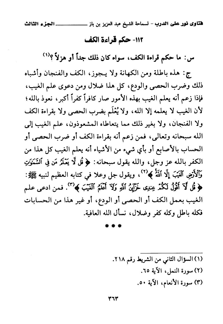 ج: هذه باطلة ومن الكهانة ولا يجوز، الكف والفنجان وأشباه ذلك وضرب الحصى والودع، كل هذا ضلال ومن دعوى علم الغيب، فإذا زعم أنه يعلم الغيب بهذه الأمور صار كافرا كفرا أكبر، نعوذ بالله؛ لأن الغيب لا يعلمه إلا الله، ولا يعلم بضرب الحصى ولا بقراءة الكف ولا الفنجان، ولا بغير ذلك مما يتعاطاه المشعوذون، علم الغيب إلى الله سبحانه وتعالى، فمن زعم أنه بقراءة الكف أو ضرب الحصى أو الحساب بالأصابع أو بأي شيء من الأشياء أنه يعلم الغيب كل هذا من الكفر بالله عز وجل، والله يقول سبحانه: {قُلْ لَا يَعْلَمُ مَنْ فِي السَّمَاوَاتِ وَالْأَرْضِ الْغَيْبَ إِلَّا اللَّهُ} (¬2)، ويقول جل وعلا في كتابه العظيم لنبيه صلى الله عليه وسلم: {قُلْ لَا أَقُولُ لَكُمْ عِنْدِي خَزَائِنُ اللَّهِ وَلَا أَعْلَمُ الْغَيْبَ} (¬3). فمن ادعى علم الغيب بعمل الكف أو الحصى أو الودع، أو غير هذا من الحسابات فكله باطل وكله كفر وضلال، نسأل الله العافية.