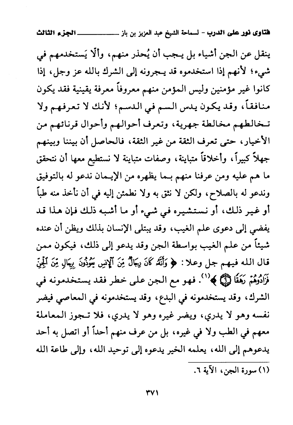ينقل عن الجن أشياء بل يجب أن يحذر منهم، وألا يستخدمهم في شيء؛ لأنهم إذا استخدموه قد يجرونه إلى الشرك بالله عز وجل، إذا كانوا غير مؤمنين وليس المؤمن منهم معروفا معرفة يقينية فقد يكون منافقا، وقد يكون يدس السم في الدسم؛ لأنك لا تعرفهم ولا تخالطهم مخالطة جهرية، وتعرف أحوالهم وأحوال قرنائهم من الأخيار، حتى تعرف الثقة من غير الثقة، فالحاصل أن بيننا وبينهم جهلا كبيرا، وأخلاقا متباينة، وصفات متباينة لا نستطيع معها أن نتحقق ما هم عليه ومن عرفنا منهم بما يظهره من الإيمان ندعو له بالتوفيق وندعو له بالصلاح، ولكن لا نثق به ولا نطمئن إليه في أن نأخذ منه طبا أو غير ذلك، أو نستشيره في شيء أو ما أشبه ذلك فإن هذا قد يفضي إلى دعوى علم الغيب، وقد يبتلى الإنسان بذلك ويظن أن عنده شيئا من علم الغيب بواسطة الجن وقد يدعو إلى ذلك، فيكون ممن قال الله فيهم جل وعلا: {وَأَنَّهُ كَانَ رِجَالٌ مِنَ الْإِنْسِ يَعُوذُونَ بِرِجَالٍ مِنَ الْجِنِّ فَزَادُوهُمْ رَهَقًا} (¬1). فهو مع الجن على خطر فقد يستخدمونه في الشرك، وقد يستخدمونه في البدع، وقد يستخدمونه في المعاصي فيضر نفسه وهو لا يدري، ويضر غيره وهو لا يدري، فلا تجوز المعاملة معهم في الطب ولا في غيره، بل من عرف منهم أحدا أو اتصل به أحد يدعوهم إلى الله، يعلمه الخير، يدعوه على توحيد الله، وإلى طاعة الله