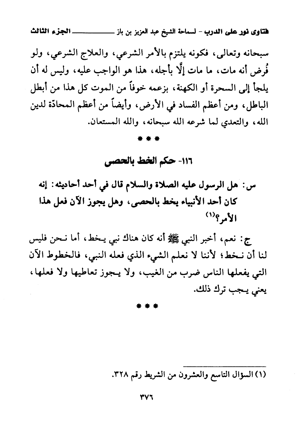 س: هل الرسول عليه الصلاة والسلام قال في أحد أحاديثه: إنه كان أحد الأنبياء يخط بالحصى، وهل يجوز الآن فعل هذا الأمر؟ (¬1)