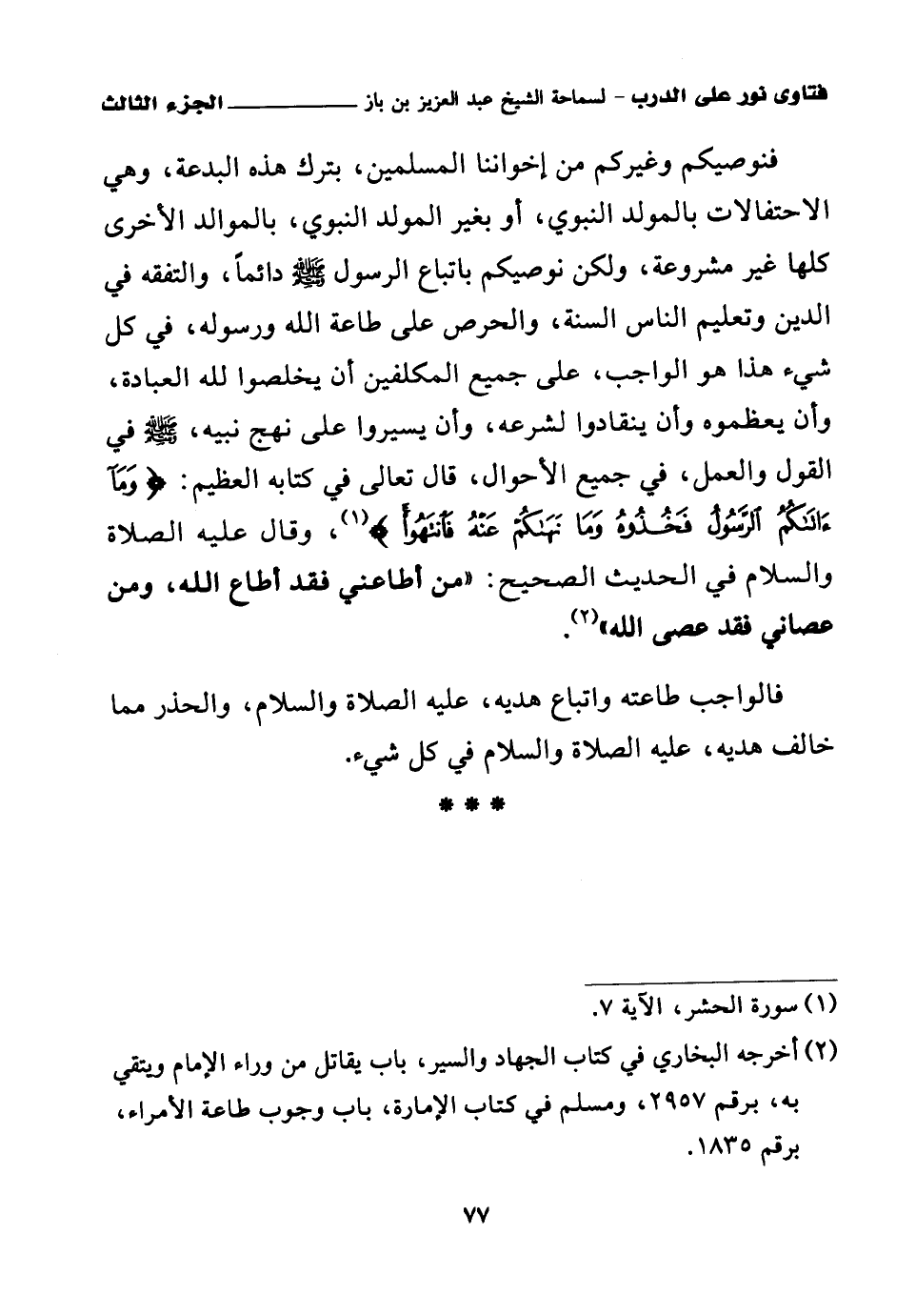 فنوصيكم وغيركم من إخواننا المسلمين، بترك هذه البدعة، وهي الاحتفالات بالمولد النبوي، أو بغير المولد النبوي، بالموالد الأخرى كلها غير مشروعة، ولكن نوصيكم باتباع الرسول صلى الله عليه وسلم دائما، والتفقه في الدين وتعليم الناس السنة، والحرص على طاعة الله ورسوله، في كل شيء هذا هو الواجب، على جميع المكلفين أن يخلصوا لله العبادة، وأن يعظموه وأن ينقادوا لشرعه، وأن يسيروا على نهج نبيه، صلى الله عليه وسلم في القول والعمل، في جميع الأحوال، قال تعالى في كتابه العظيم: {وَمَا آتَاكُمُ الرَّسُولُ فَخُذُوهُ وَمَا نَهَاكُمْ عَنْهُ فَانْتَهُوا} (¬1)، وقال عليه الصلاة والسلام في الحديث الصحيح: «من أطاعني فقد أطاع الله، ومن عصاني فقد عصى الله. (¬2)»
