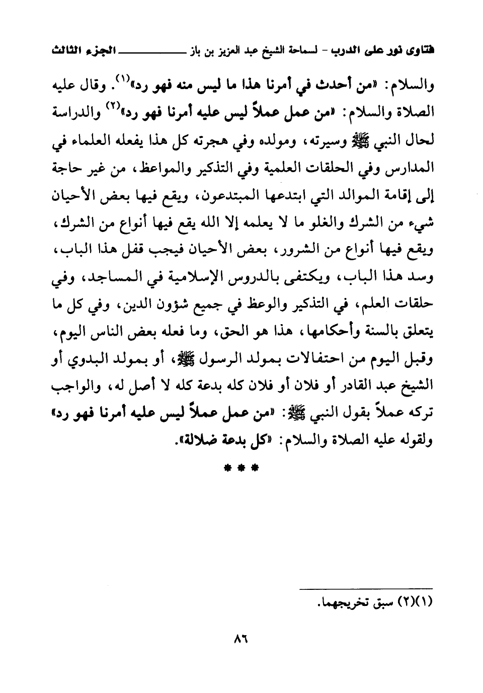 والسلام: «من أحدث في أمرنا هذا ما ليس منه فهو رد (¬1)»، وقال عليه الصلاة والسلام: «من عمل عملا ليس عليه أمرنا فهو رد (¬2)» والدراسة لحال النبي صلى الله عليه وسلم وسيرته، ومولده وفي هجرته كل هذا يفعله العلماء في المدارس وفي الحلقات العلمية وفي التذكير والمواعظ، من غير حاجة إلى إقامة الموالد التي ابتدعها المبتدعون، ويقع فيها بعض الأحيان شيء من الشرك والغلو ما لا يعلمه إلا الله يقع فيها أنواع من الشرك، ويقع فيها أنواع من الشرور، بعض الأحيان فيجب قفل هذا الباب، وسد هذا الباب، ويكتفى بالدروس الإسلامية في المساجد، وفي حلقات العلم، في التذكير والوعظ في جميع شئون الدين، وفي كل ما يتعلق بالسنة وأحكامها، هذا هو الحق، وما فعله بعض الناس اليوم، وقبل اليوم من احتفالات بمولد الرسول صلى الله عليه وسلم، أو بمولد البدوي أو الشيخ عبد القادر أو فلان أو فلان كله بدعة كله لا أصل له، والواجب تركه عملا بقول النبي صلى الله عليه وسلم: «من عمل عملا ليس عليه أمرنا فهو رد (¬3)»، ولقوله عليه الصلاة والسلام: «كل بدعة ضلالة (¬4)».