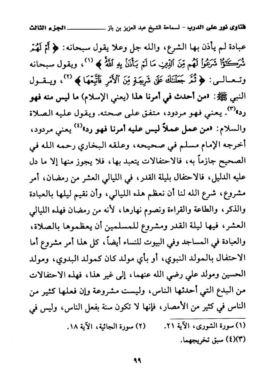 عبادة لم يأذن بها الشرع، والله جل وعلا يقول سبحانه: {أَمْ لَهُمْ شُرَكَاءُ شَرَعُوا لَهُمْ مِنَ الدِّينِ مَا لَمْ يَأْذَنْ بِهِ اللَّهُ} (¬1)، ويقول سبحانه وتعالى: {ثُمَّ جَعَلْنَاكَ عَلَى شَرِيعَةٍ مِنَ الْأَمْرِ فَاتَّبِعْهَا} (¬2)، ويقول النبي صلى الله عليه وسلم: «من أحدث في أمرنا هذا (يعني الإسلام) ما ليس منه فهو رد (¬3)» يعني فهو مردود، متفق على صحته. ويقول عليه الصلاة والسلام: «من عمل عملا ليس عليه أمرنا فهو رد (¬4)» يعني مردود، أخرجه الإمام مسلم في صحيحه، وعلقه البخاري رحمه الله في الصحيح جازما به، فالاحتفالات يتعبد بها، فلا يجوز منها إلا ما دل عليه الدليل، فالاحتفال بليلة القدر، في الليالي العشر من رمضان، أمر مشروع، شرع الله لنا أن نعظم هذه الليالي، وأن نقيم ليلها بالعبادة والذكر، والطاعة والقراءة ونصوم نهارها، لأنه من رمضان فهذه الليالي العشر، فيها ليلة القدر ومشروع للمسلمين أن يعظموها بالصلاة، والعبادة في المساجد وفي البيوت للنساء أيضا، كل هذا أمر مشروع أما الاحتفال بالمولد النبوي، أو بأي مولد كان كمولد البدوي، ومولد الحسين ومولد علي رضي الله عنهما، إلى غير هذا، فهذه الاحتفالات من البدع التي أحدثها الناس، وليست مشروعة وإن فعلها كثير من الناس في كثير من الأمصار، فإنها لا تكون سنة بفعل الناس، وليس في