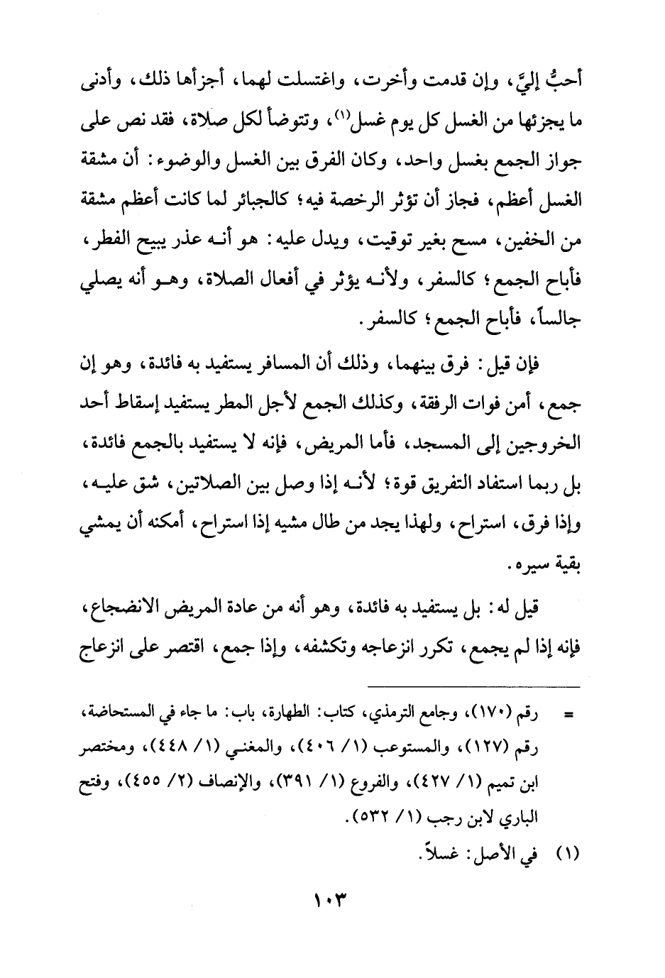 = رقم (170)، وجامع الترمذي، كتاب: الطهارة، باب: ما جاء في المستحاضة، رقم (127)، والمستوعب (1/ 406)، والمغني (1/ 448)، ومختصر ابن تميم (1/ 427)، والفروع (1/ 391)، والإنصاف (2/ 455)، وفتح الباري لابن رجب (1/ 532).