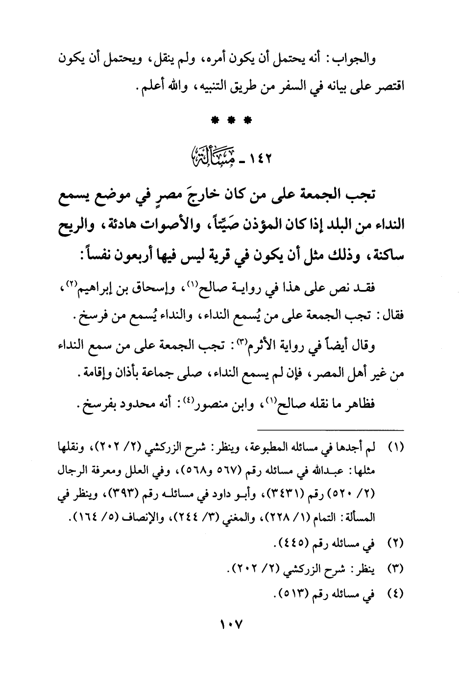 142 - مَسْألَة: تجب الجمعة على من كان خارجَ مصرٍ في موضع يسمع النداء من البلد إذا كان المؤذن صَيِّتًا، والأصوات هادئة، والريح ساكنة، وذلك مثل أن يكون في قرية ليس فيها أربعون نفسًا: