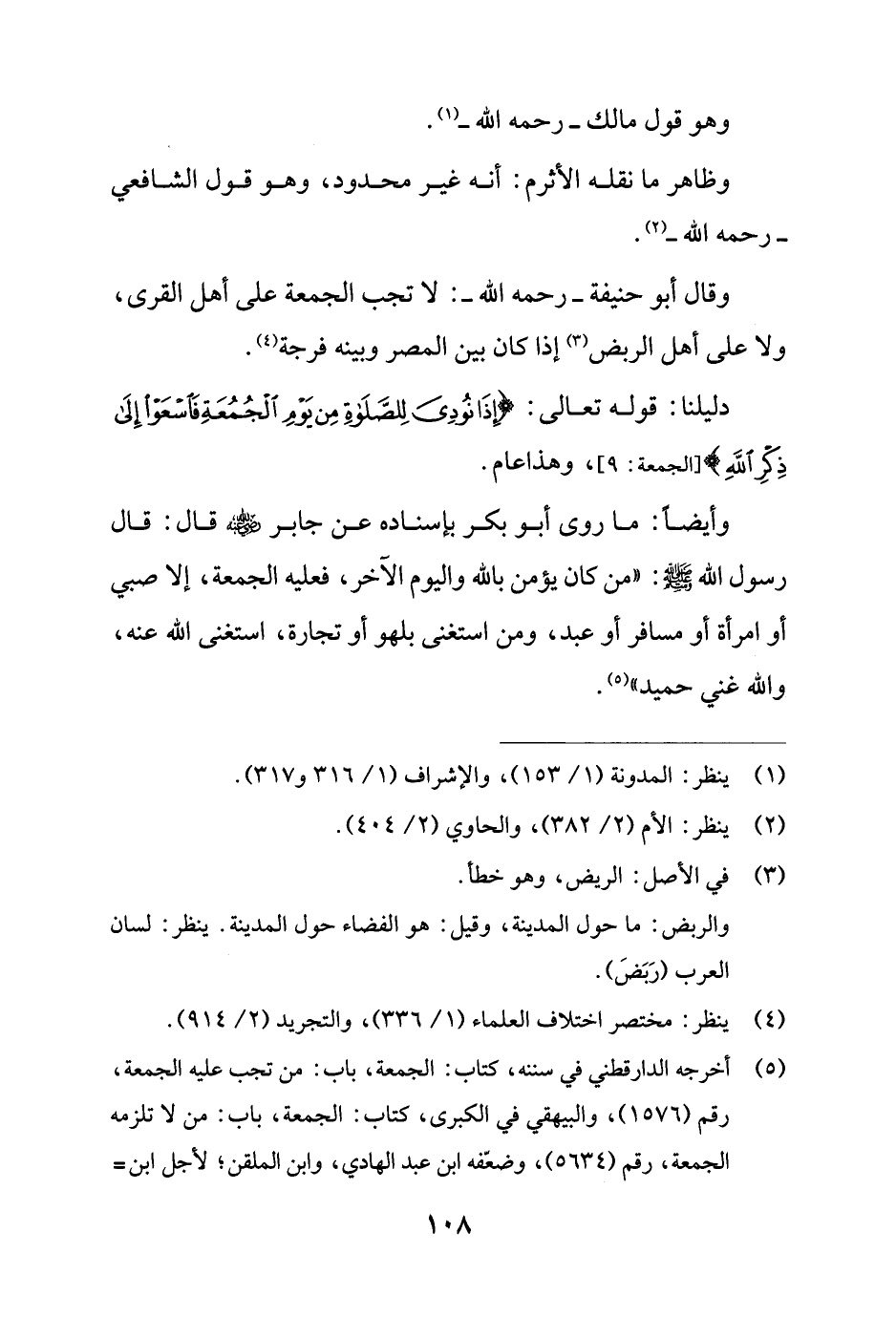 (¬5) أخرجه الدارقطني في سننه، كتاب: الجمعة، باب: من تجب عليه الجمعة، رقم (1576)، والبيهقي في الكبرى، كتاب: الجمعة، باب: من لا تلزمه الجمعة، رقم (5634)، وضعّفه ابن عبد الهادي، وابن الملقن؛ لأجل ابن =