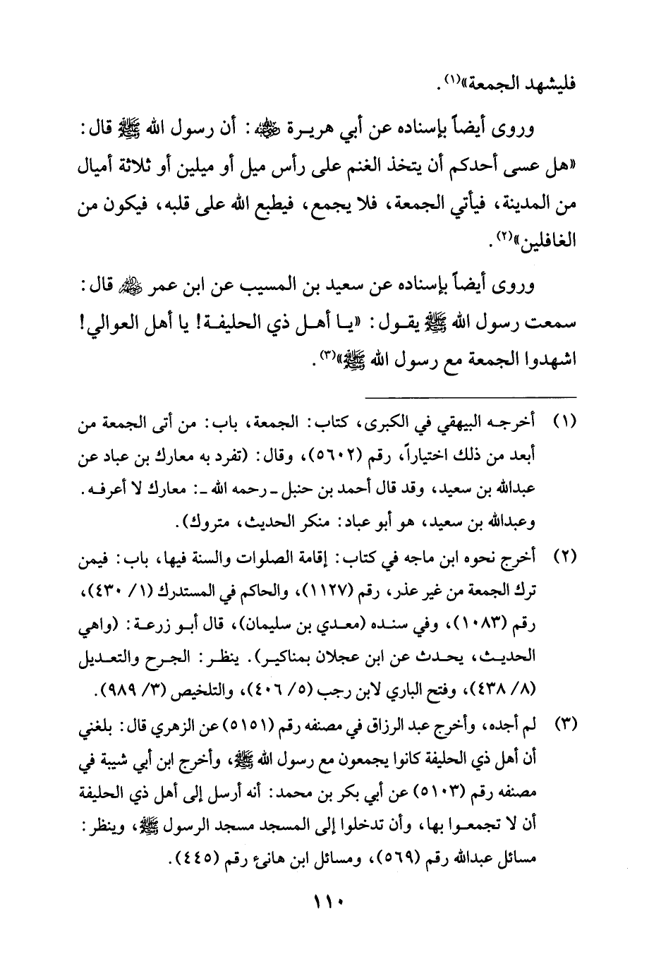 (¬3) لم أجده، وأخرج عبد الرزاق في مصنفه رقم (5151) عن الزهري قال: بلغني أن أهل ذي الحليفة كانوا يجمعون مع رسول الله - صلى الله عليه وسلم -، وأخرج ابن أبي شيبة في مصنفه رقم (5103) عن أبي بكر بن محمد: أنه أرسل إلى أهل ذي الحليفة أن لا تجمعوا بها، وأن تدخلوا إلى المسجد مسجد الرسول - صلى الله عليه وسلم -، وينظر: مسائل عبد الله رقم (569)، ومسائل ابن هانئ رقم (445).