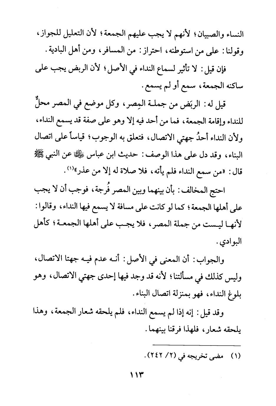 قيل له: الربَض من جملة المِصر، وكل موضع في المصر محلٌّ للنداء وإقامة الجمعة، فما من أحد فيه إلا وهو على صفة قد يسمع النداء، ولأن النداء أحدُ جهتي الاتصال، فتعلق به الوجوب؛ قياسًا على اتصال البناء، وقد دل على هذا الوصف: حديث ابن عباس - رضي الله عنهما - عن النبي - صلى الله عليه وسلم - قال: "من سمع النداء فلم يأته، فلا صلاة له إلا من عذر" (¬1).