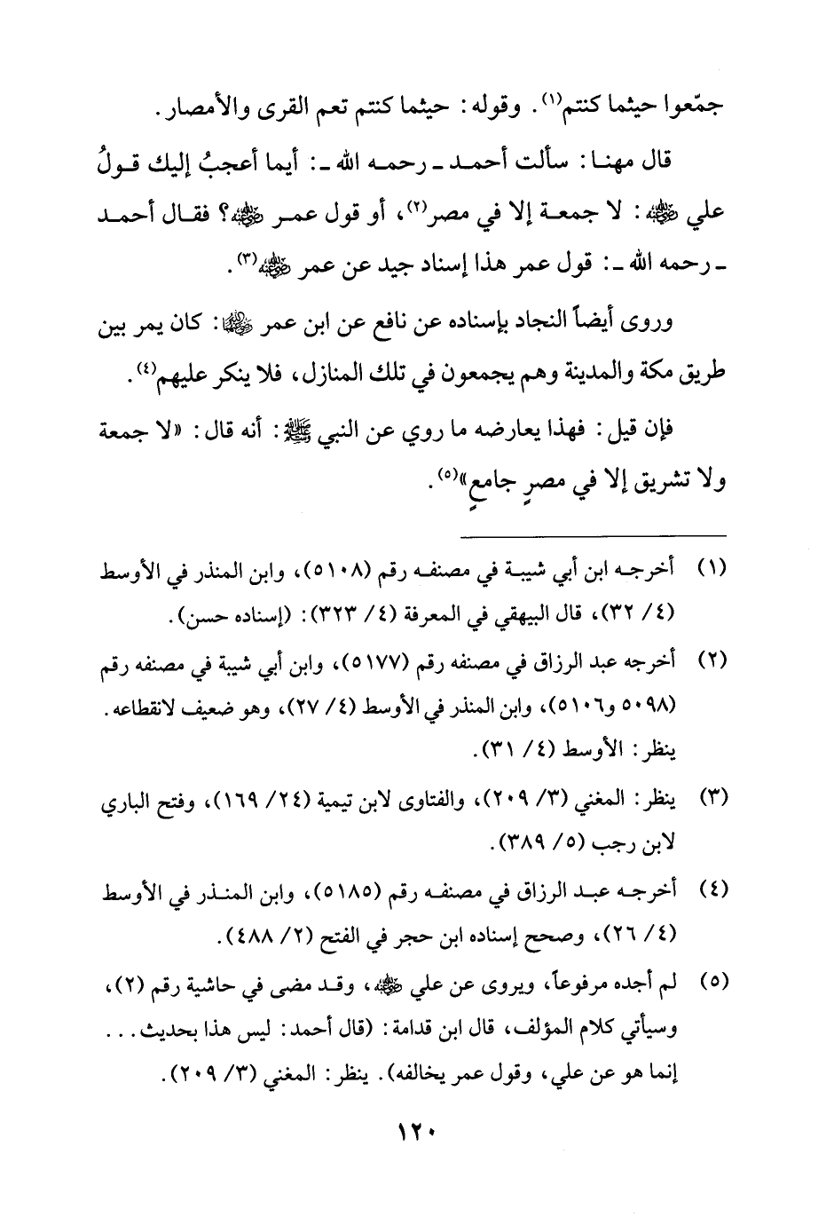 قال مهنا: سألت أحمد - رحمه الله -: أيما أعجبُ إليك قولُ علي - رضي الله عنه -: لا جمعة إلا في مصر (¬2)، أو قول عمر - رضي الله عنه -؟ فقال أحمد - رحمه الله -: قول عمر هذا إسناد جيد عن عمر - رضي الله عنه - (¬3).