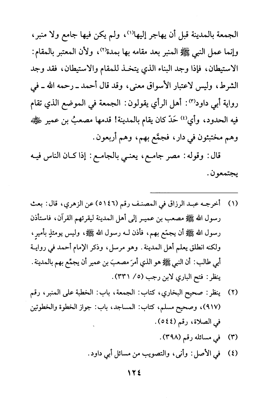 الجمعة بالمدينة قبل أن يهاجر إليها (¬1)، ولم يكن فيها جامع ولا منبر، وإنما عمل النبي - صلى الله عليه وسلم - المنبر بعد مقامه بها بمدة (¬2)، ولأن المعتبر بالمقام: الاستيطان، فإذا وجد البناء الذي يتخذ للمقام والاستيطان، فقد وجد الشرط، وليس لاعتبار الأسواق معنى، وقد قال أحمد - رحمه الله - في رواية أبي داود (¬3): أهل الرأي يقولون: الجمعة في الموضع الذي تقام فيه الحدود، وأي (¬4) حَدّ كان يقام بالمدينة! قدمها مصعبُ بن عمير - رضي الله عنه - وهم مختبئون في دار، فجمَّع بهم، وهم أربعون.