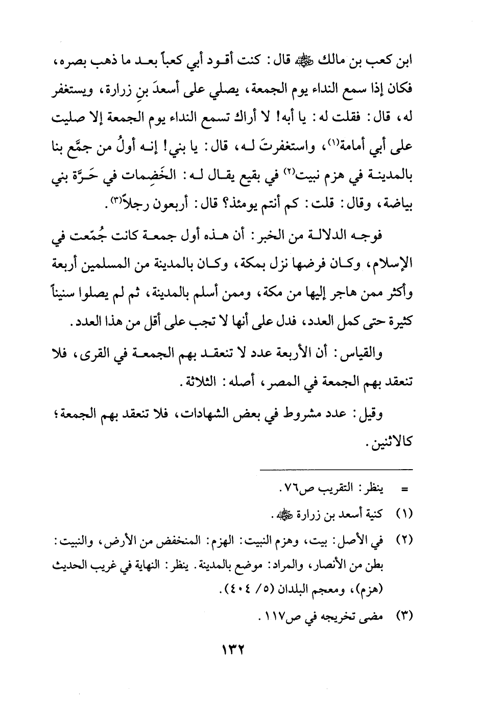 ابن كعب بن مالك - رضي الله عنه - قال: كنت أقود أبي كعبًا بعد ما ذهب بصره، فكان إذا سمع النداء يوم الجمعة، يصلي على أسعدَ بنِ زرارة، ويستغفر له، قال: فقلت له: يا أبه! لا أراك تسمع النداء يوم الجمعة إلا صليت على أبي أمامة (¬1)، واستغفرتَ له، قال: يا بني! إنه أولُ من جمَّع بنا بالمدينة في هزم نبيت (¬2) في بقيع يقال له: الخَضِمات في حَرَّة بني بياضة، وقال: قلت: كم أنتم يومئذ؟ قال: أربعون رجلًا (¬3).