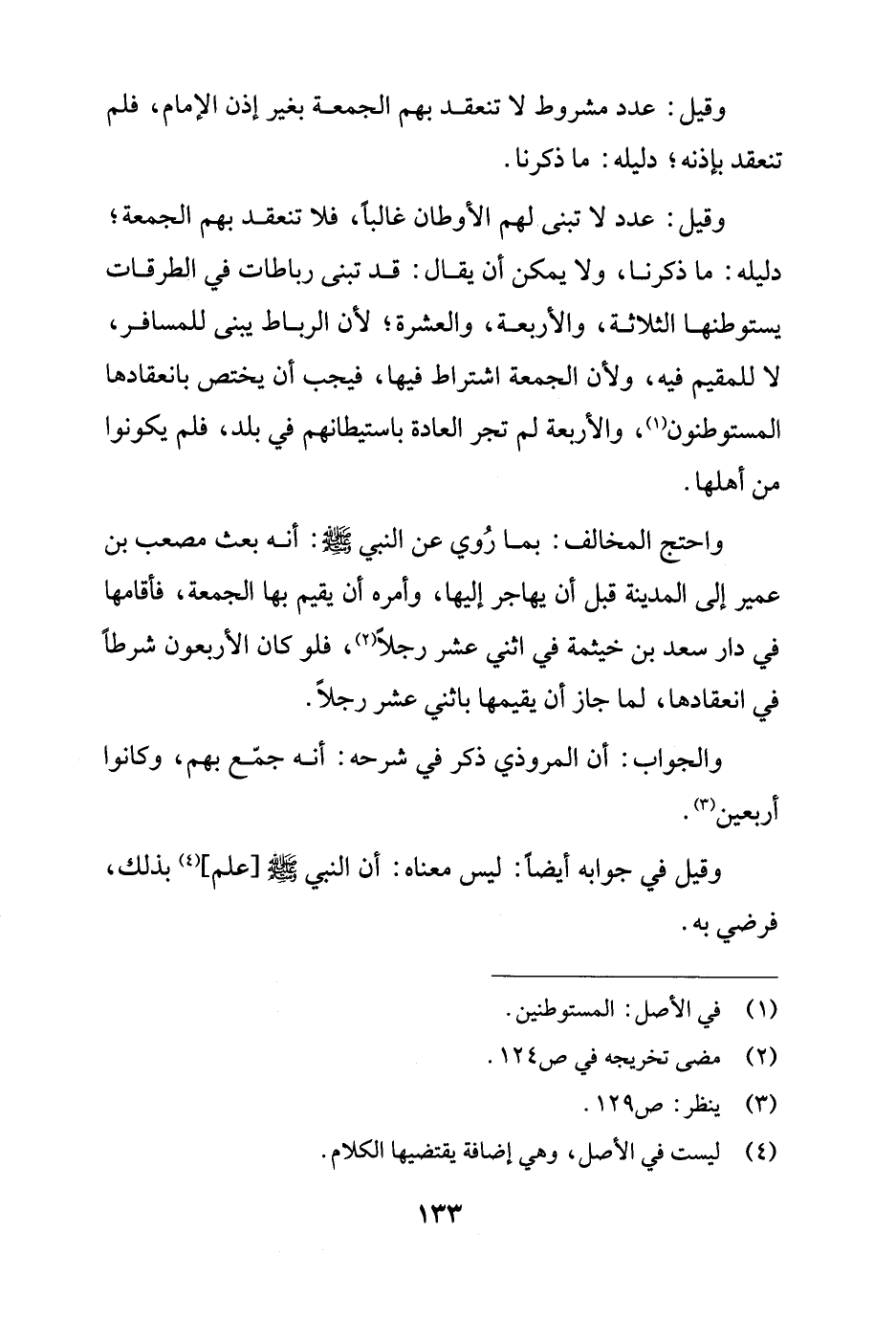 وقيل: عدد لا تبنى لهم الأوطان غالبًا، فلا تنعقد بهم الجمعة؛ دليله: ما ذكرنا، ولا يمكن أن يقال: قد تبنى رباطات في الطرقات يستوطنها الثلاثة، والأربعة، والعشرة؛ لأن الرباط يبنى للمسافر، لا للمقيم فيه، ولأن الجمعة اشتراط فيها، فيجب أن يختص بانعقادها المستوطنون (¬1)، والأربعة لم تجر العادة باستيطانهم في بلد، فلم يكونوا من أهلها.