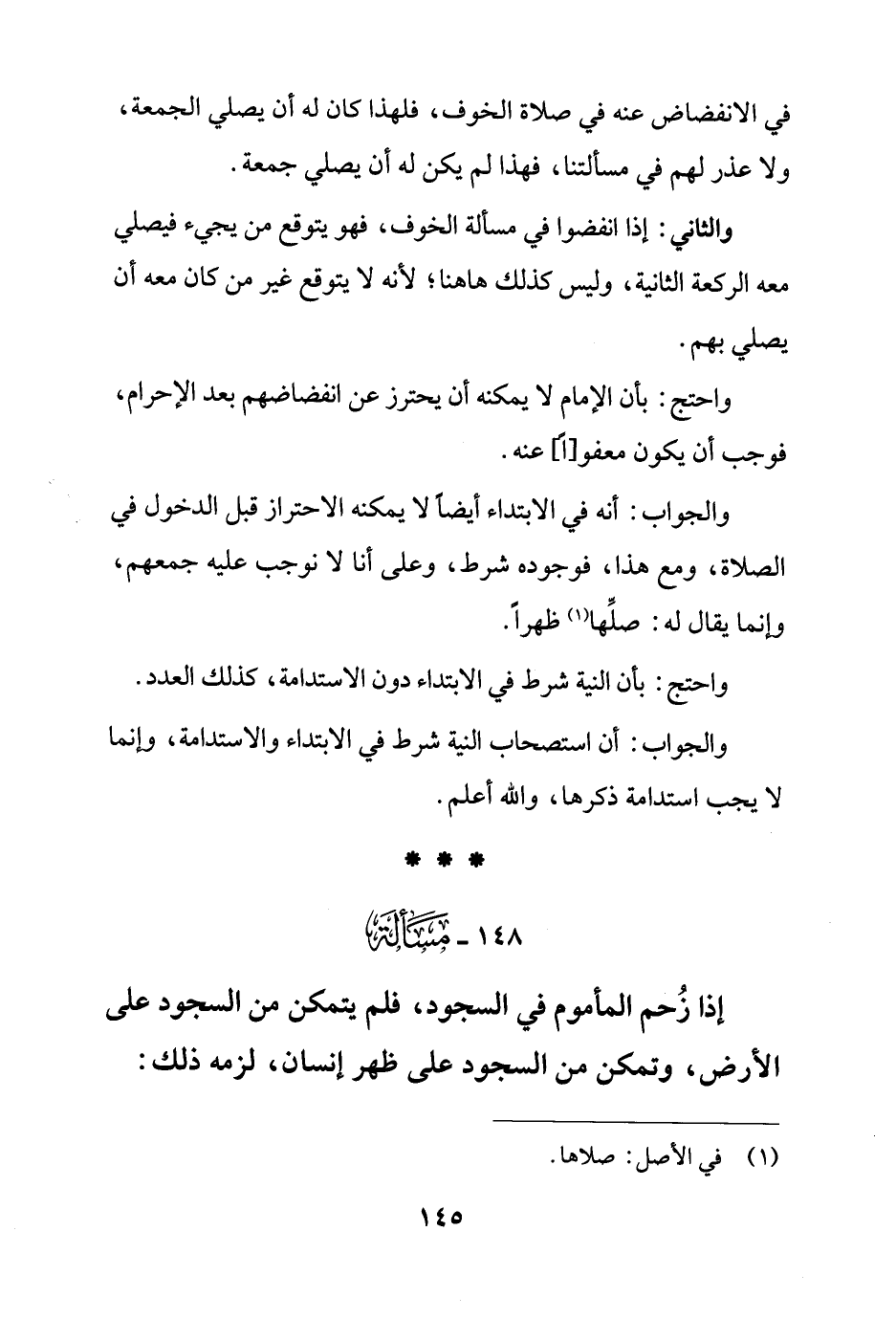 148 - مَسْألَة: إذا زُحم المأموم في السجود، فلم يتمكن من السجود على الأرض، وتمكن من السجود علي ظهر إنسان، لزمه ذلك: