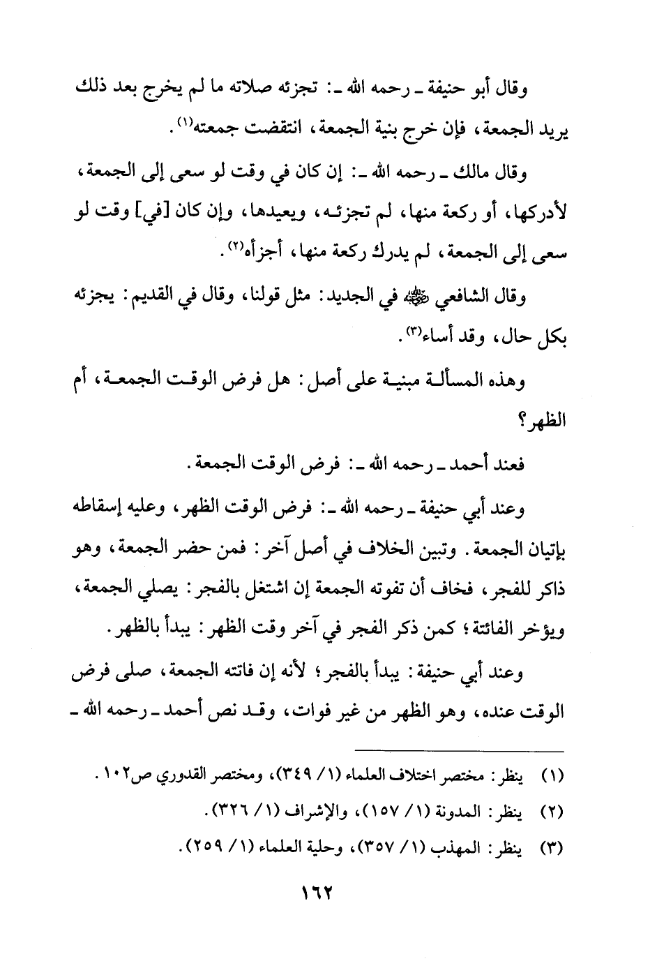 وعند أبي حنيفة - رحمه الله -: فرض الوقت الظهر، وعليه إسقاطه بإتيان الجمعة. وتبين الخلاف في أصل آخر: فمن حضر الجمعة، وهو ذاكر للفجر، فخاف أن تفوته الجمعة إن اشتغل بالفجر: يصلي الجمعة، ويؤخر الفائتة؛ كمن ذكر الفجر في آخر وقت الظهر: يبدأ بالظهر.