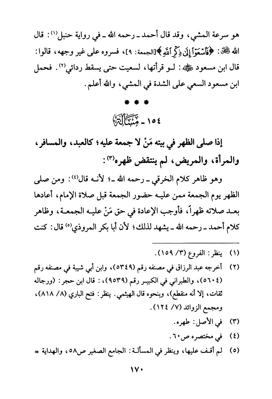154 - مَسْألَة: إذا صلى الظهر في بيته مَنْ لا جمعة عليه؛ كالعبد، والمسافر، والمرأة، والمريض، لم ينتقض ظهره (¬3):