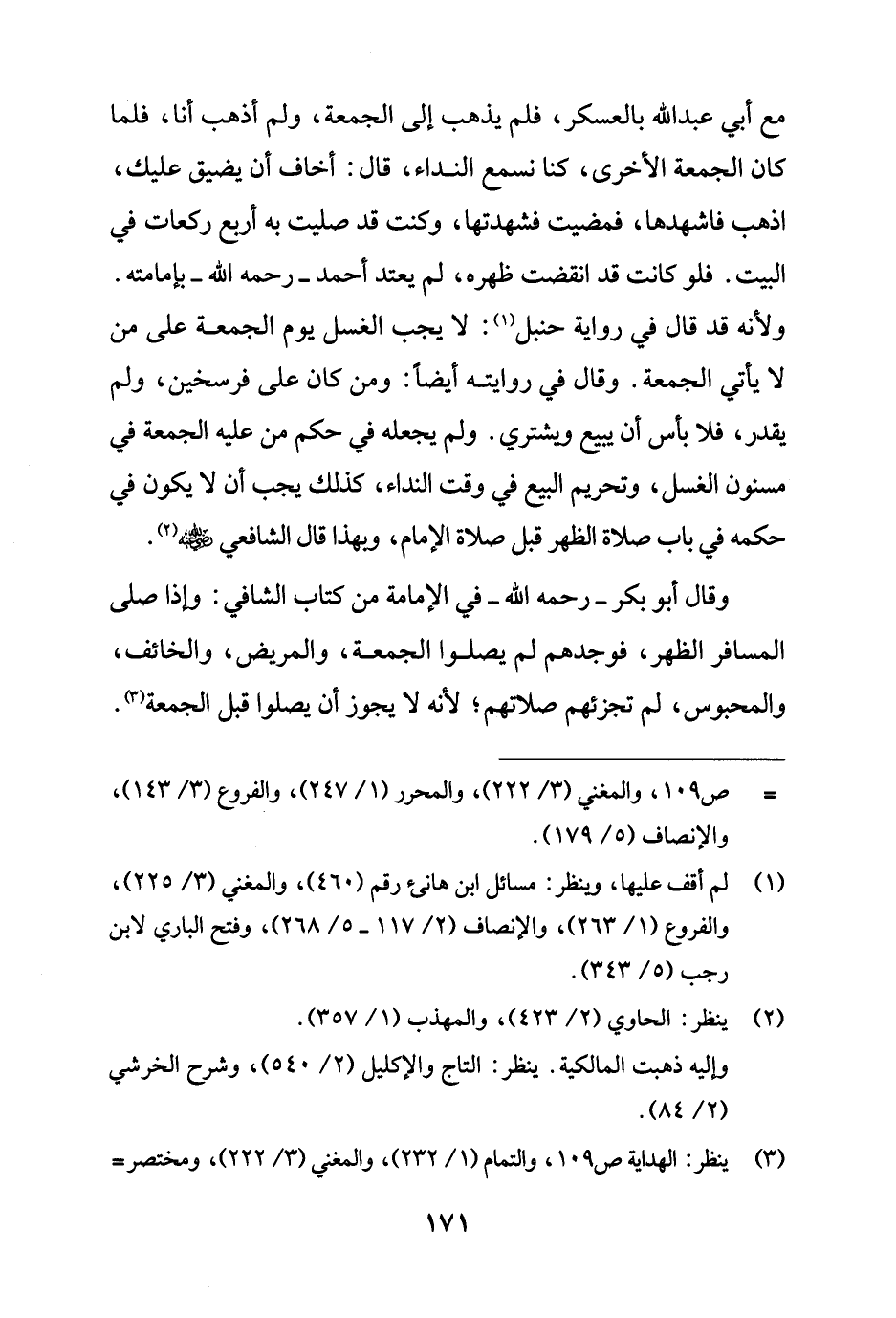 مع أبي عبد الله بالعسكر، فلم يذهب إلى الجمعة، ولم أذهب أنا، فلما كان الجمعة الأخرى، كنا نسمع النداء، قال: أخاف أن يضيق عليك، اذهب فاشهدها، فمضيت فشهدتها، وكنت قد صليت به أربع ركعات في البيت. فلو كانت قد انقضت ظهره، لم يعتد أحمد - رحمه الله - بإمامته. ولأنه قد قال في رواية حنبل (¬1): لا يجب الغسل يوم الجمعة على من لا يأتي الجمعة. وقال في روايته أيضًا: ومن كان على فرسخين، ولم يقدر، فلا بأس أن يبيع ويشتري. ولم يجعله في حكم من عليه الجمعة في مسنون الغسل، وتحريم البيع في وقت النداء، كذلك يجب أن لا يكون في حكمه في باب صلاة الظهر قبل صلاة الإمام، وبهذا قال الشافعي - رضي الله عنه - (¬2).