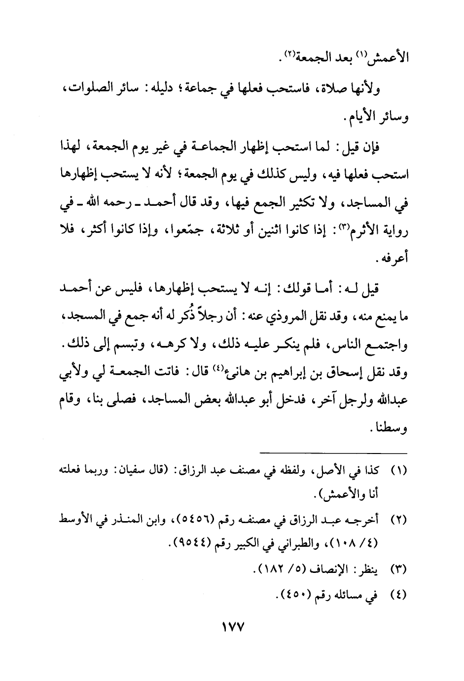 فإن قيل: لما استحب إظهار الجماعة في غير يوم الجمعة، لهذا استحب فعلها فيه، وليس كذلك في يوم الجمعة؛ لأنه لا يستحب إظهارها في المساجد، ولا تكثير الجمع فيها، وقد قال أحمد - رحمه الله - في رواية الأثرم (¬3): إذا كانوا اثنين أو ثلاثة، جمّعوا، وإذا كانوا أكثر، فلا أعرفه.