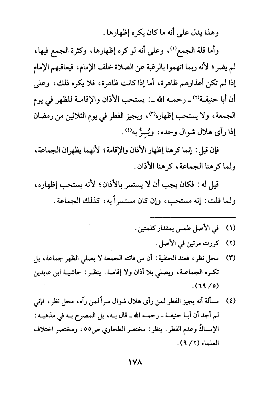 وأما قلة الجمع (¬1)، وعلى أنه لو كره إظهارها، وكثرة الجمع فيها، لم يضر؛ لأنه ربما اتهموا بالرغبة عن الصلاة خلف الإمام، فيعاقبهم الإمام إذا لم تكن أعذارهم ظاهرة، أما إذا كانت ظاهرة، فلا يكره ذلك، وعلى أن أبا حنيفة (¬2) - رحمه الله -: يستحب الأذان والإقامة للظهر في يوم الجمعة، ولا يستحب إظهاره (¬3)، ويجيز الفطر في يوم الثلاثين من رمضان إذا رأى هلال شوال وحده، ويُسِرُّ به (¬4).