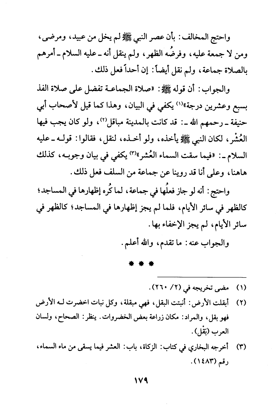 والجواب: أن قوله - صلى الله عليه وسلم -: "صلاة الجماعة تفضل على صلاة الفذ بسبع وعشرين درجة" (¬1) يكفي في البيان، وهذا كما قيل لأصحاب أبي حنيفة - رحمهم الله -: قد كانت بالمدينة مباقل (¬2)، ولو كان يجب فيها العُشْر، لكان النبي - صلى الله عليه وسلم - يأخذه، ولو أخذه، لنقل، فقالوا: قوله - عليه السلام -: "فيما سقت السماء العُشر" (¬3) يكفي في بيان وجوبه، كذلك ها هنا، وعلى أنا قد روينا عن جماعة من السلف فعل ذلك.