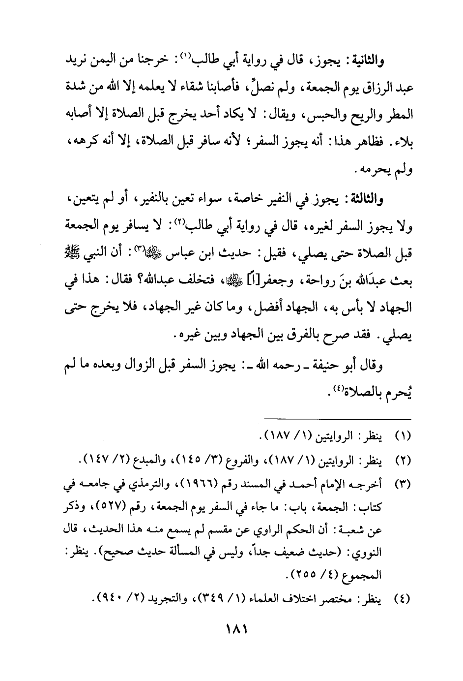 والثالثة: يجوز في النفير خاصة، سواء تعين بالنفير، أو لم يتعين، ولا يجوز السفر لغيره، قال في رواية أبي طالب (¬2): لا يسافر يوم الجمعة قبل الصلاة حتى يصلي، فقيل: حديث ابن عباس - رضي الله عنهما - (¬3): أن النبي - صلى الله عليه وسلم - بعث عبدَ الله بنَ رواحة، وجعفر [اً]- رضي الله عنهما -، فتخلف عبد الله؟ فقال: هذا في الجهاد لا بأس به، الجهاد أفضل، وما كان غير الجهاد، فلا يخرج حتى يصلي. فقد صرح بالفرق بين الجهاد وبين غيره.