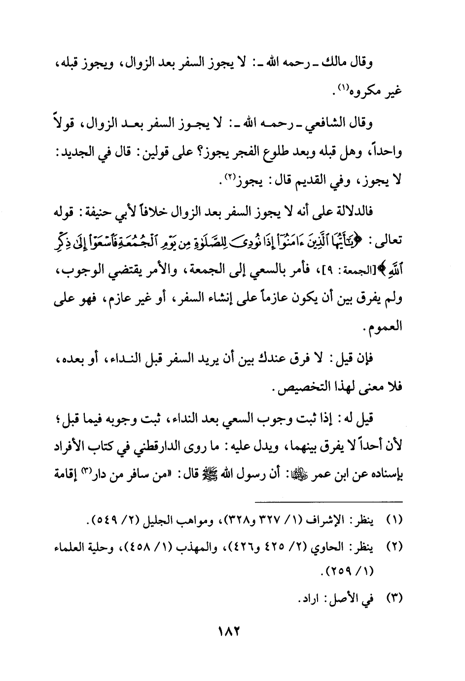 فالدلالة على أنه لا يجوز السفر بعد الزوال خلافًا لأبي حنيفة: قوله تعالى: {يَاأَيُّهَا الَّذِينَ آمَنُوا إِذَا نُودِيَ لِلصَّلَاةِ مِنْ يَوْمِ الْجُمُعَةِ فَاسْعَوْا إِلَى ذِكْرِ اللَّهِ} [الجمعة: 9] , فأمر بالسعي إلى الجمعة، والأمر يقتضي الوجوب، ولم يفرق بين أن يكون عازمًا على إنشاء السفر، أو غير عازم، فهو على العموم.