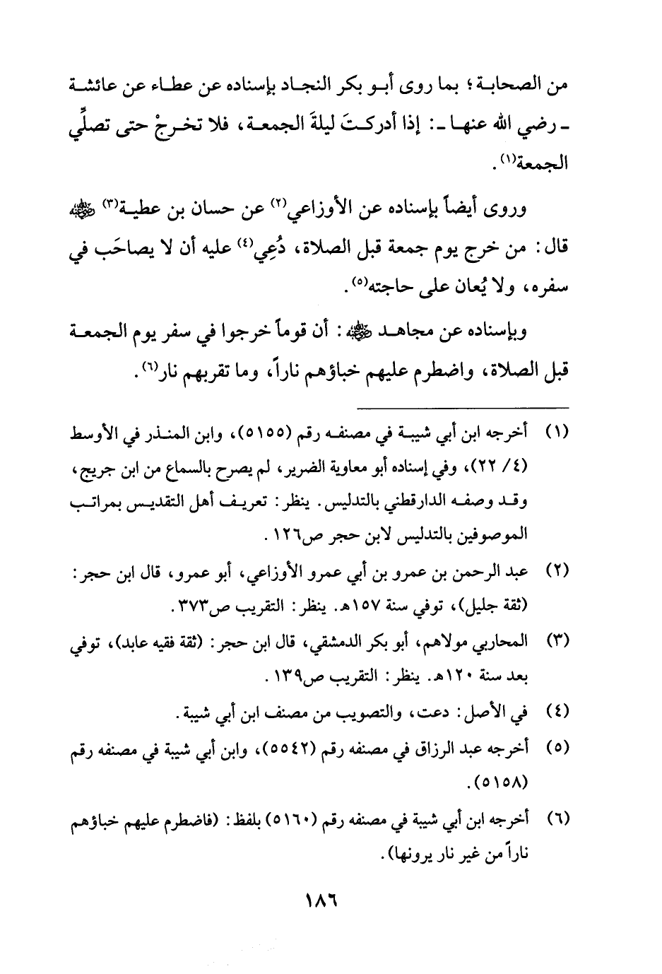 من الصحابة؛ بما روى أبو بكر النجاد بإسناده عن عطاء عن عائشة - رضي الله عنها -: إذا أدركتَ ليلةَ الجمعة، فلا تخرجْ حتى تصلِّي الجمعة (¬1).