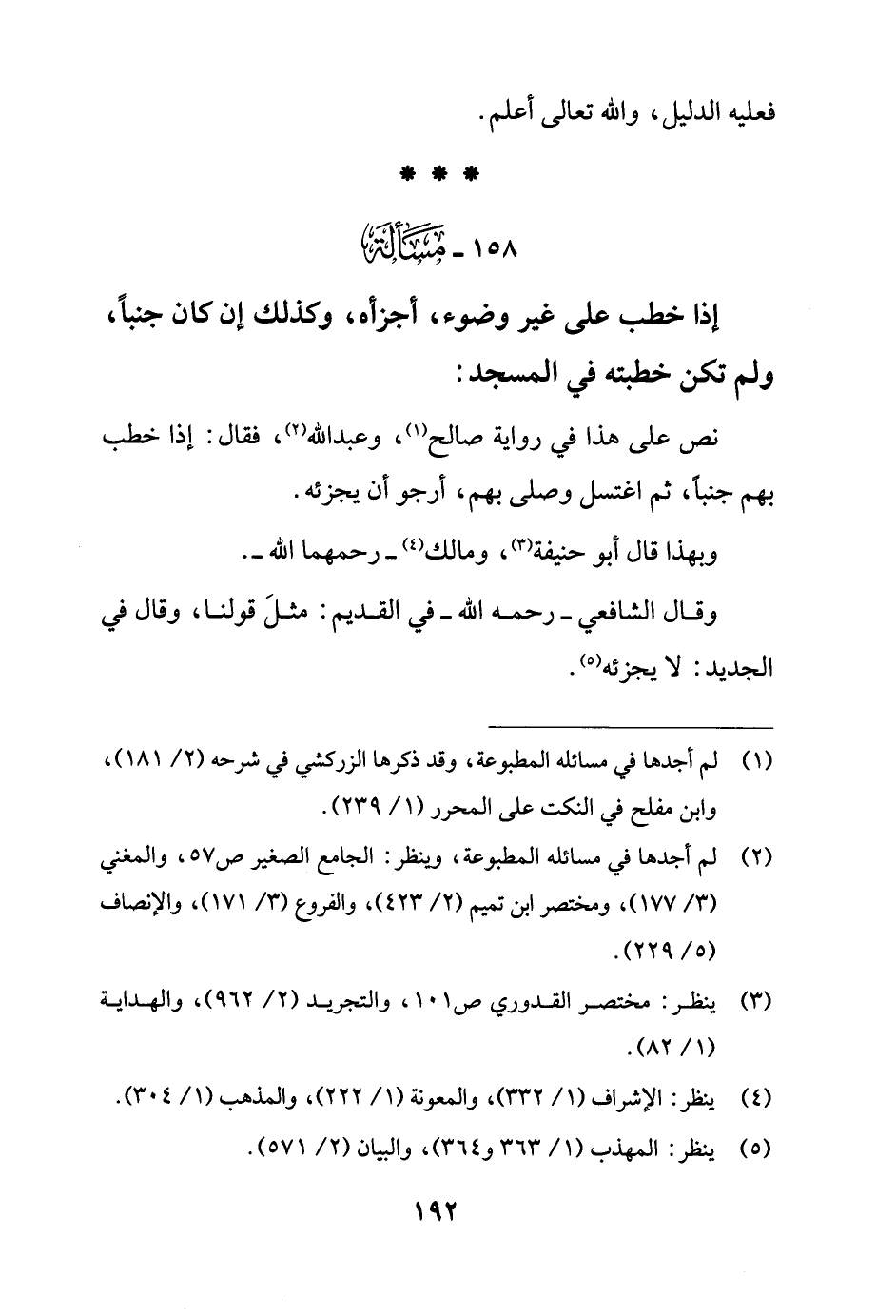 158 - مَسْألَة: إذا خطب على غير وضوء، أجزأه، وكذلك إن كان جنبًا، ولم تكن خطبته في المسجد: