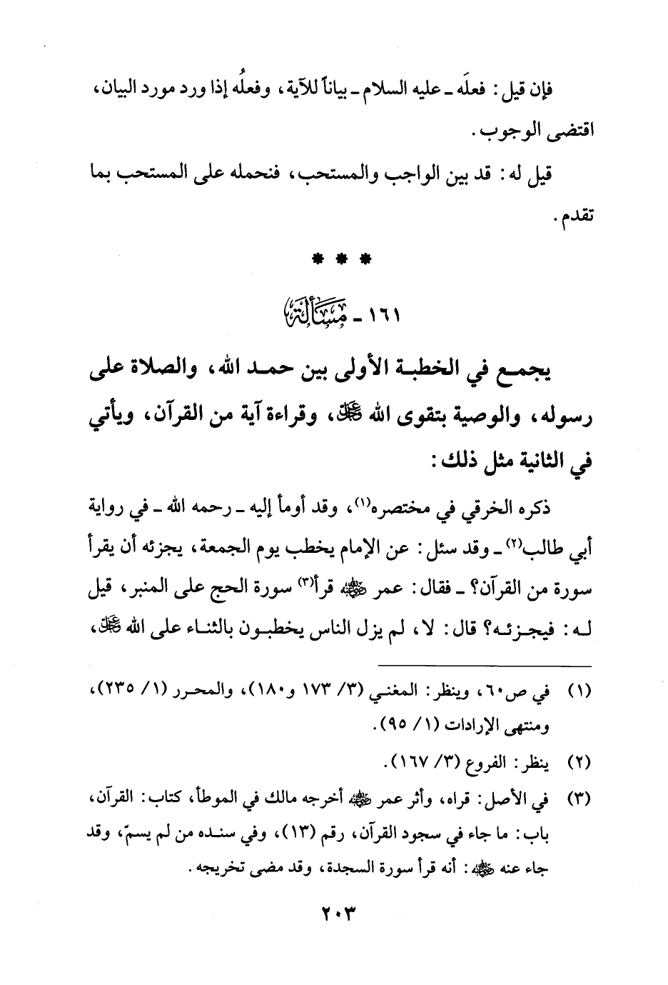 161 - مَسْألَة: يجمع في الخطبة الأولى بين حمد الله، والصلاة على رسوله، والوصية بتقوى الله - عز وجل -، وقراءة آية من القرآن، ويأتي في الثانية مثل ذلك: