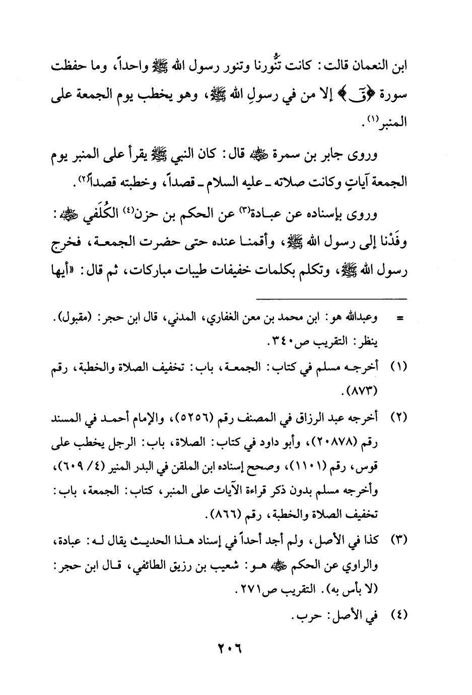 وروى بإسناده عن عبادة (¬3) عن الحكم بن حزن (¬4) الكُلَفي - رضي الله عنه -: وفَدْنا إلى رسول الله - صلى الله عليه وسلم -، وأقمنا عنده حتى حضرت الجمعة، فخرج رسول الله - صلى الله عليه وسلم -، وتكلم بكلمات خفيفات طيبات مباركات، ثم قال: "أيها