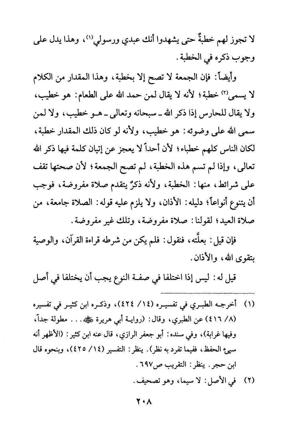 وأيضًا: فإن الجمعة لا تصح إلا بخطبة، وهذا المقدار من الكلام لا يسمى (¬2) خطبة؛ لأنه لا يقال لمن حمد الله على الطعام: هو خطيب، ولا يقال للحارس إذا ذكر الله - سبحانه وتعالى - هو خطيب، ولا لمن سمى الله على وضوئه: هو خطيب، ولأنه لو كان ذلك المقدار خطبة، لكان الناس كلهم خطباء؛ لأن أحدًا لا يعجز عن إتيان كلمة فيها ذكر الله تعالى، وإذا لم تسم هذه الخطبة، لم تصح الجمعة؛ لأن صحتها تقف على شرائط، منها: الخطبة، ولأنه ذكرٌ يتقدم صلاة مفروضة، فوجب أن يتنوع أنواعًا؛ دليله: الأذان، ولا يلزم عليه قوله: الصلاة جامعة، من صلاة العيد؛ لقولنا: صلاة مفروضة، وتلك غير مفروضة.