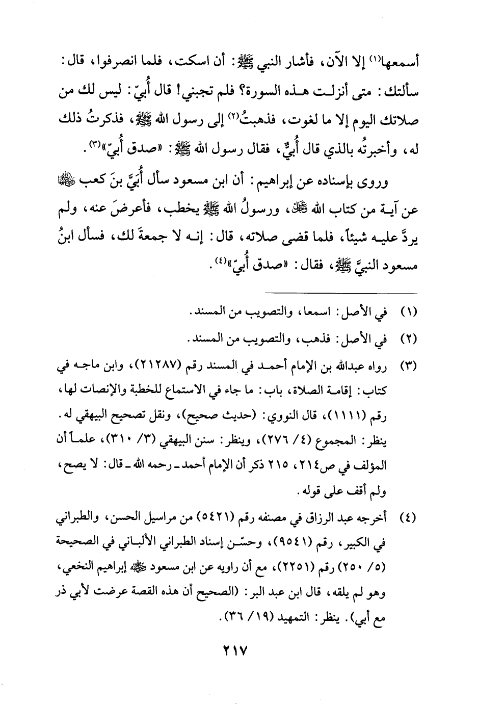وروى بإسناده عن إبراهيم: أن ابن مسعود سأل أُبَيَّ بنَ كعب - رضي الله عنهما - عن آية من كتاب الله - عز وجل -، ورسولُ الله - صلى الله عليه وسلم - يخطب، فأعرضَ عنه، ولم يردَّ عليه شيئًا، فلما قضى صلاته، قال: إنه لا جمعةَ لك، فسأل ابنُ مسعود النبيَّ - صلى الله عليه وسلم -، فقال: "صدق أُبيّ" (¬4).