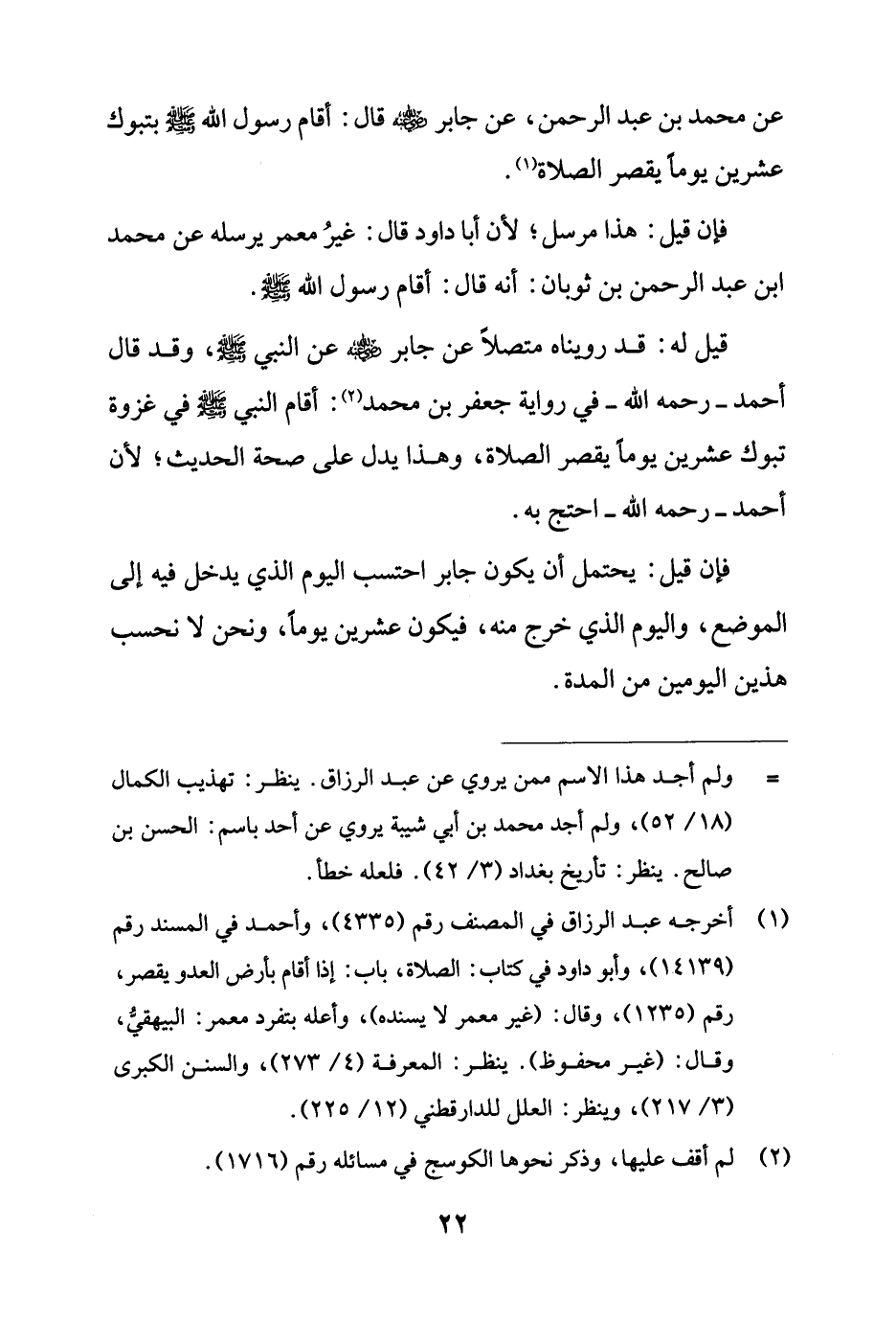 عن محمد بن عبد الرحمن، عن جابر - رضي الله عنه - قال: أقام رسول الله - صلى الله عليه وسلم - بتبوك عشرين يومًا يقصر الصلاة (¬1).
